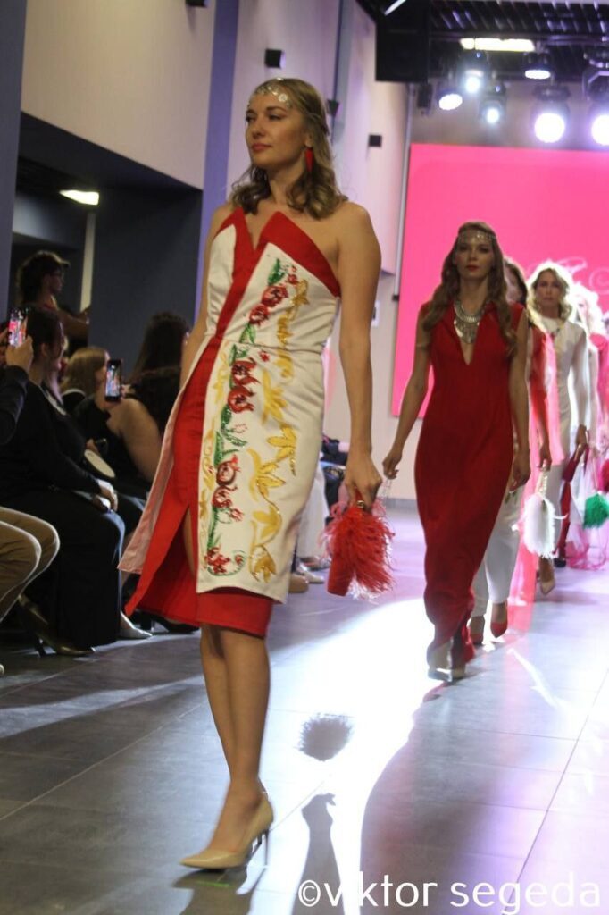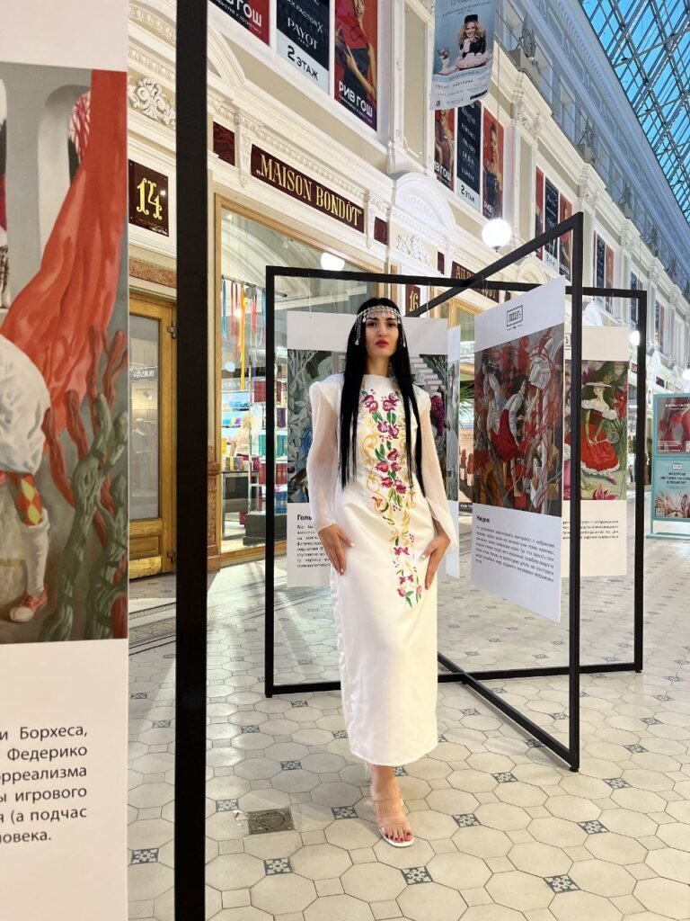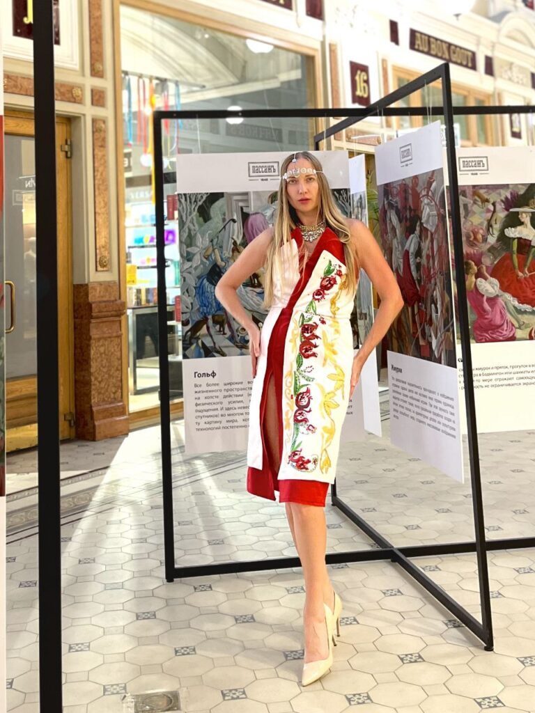 Это идею я и воплотила, уже учась в Альтшу Университет. Я сдавала дипломную работу на курсах 2022 г., и в это время я путешествовала по Грузии по местам моего детства и моего рождения. Конечно, воспоминания нахлынули, и я с большой любовью и душой создала коллекцию «Гранат Армении. Седа». Я использовала древние орнаменты Армении. На ткани ручная роспись без трафаретов.