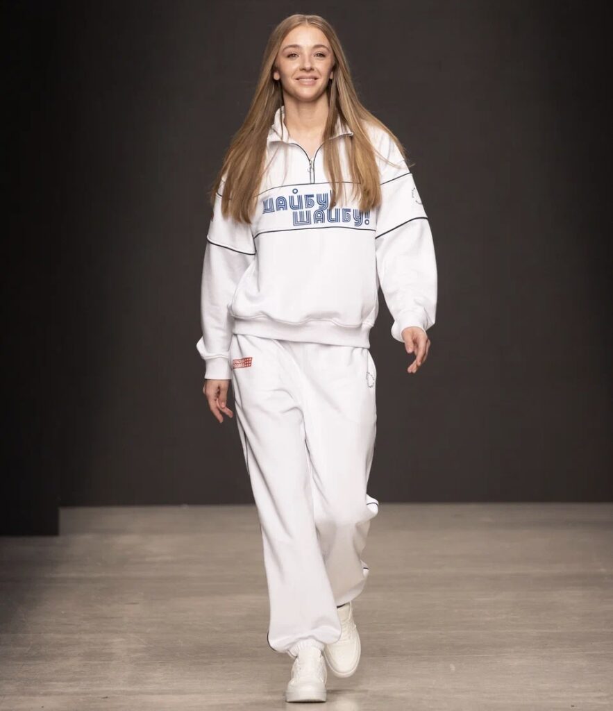 На подиуме — удобные спортивные образы, однотонные или с яркими принтами и мотивирующими надписями. Ключевые оттенки коллекции — глубокий синий, чистый белый и насыщенный красный.