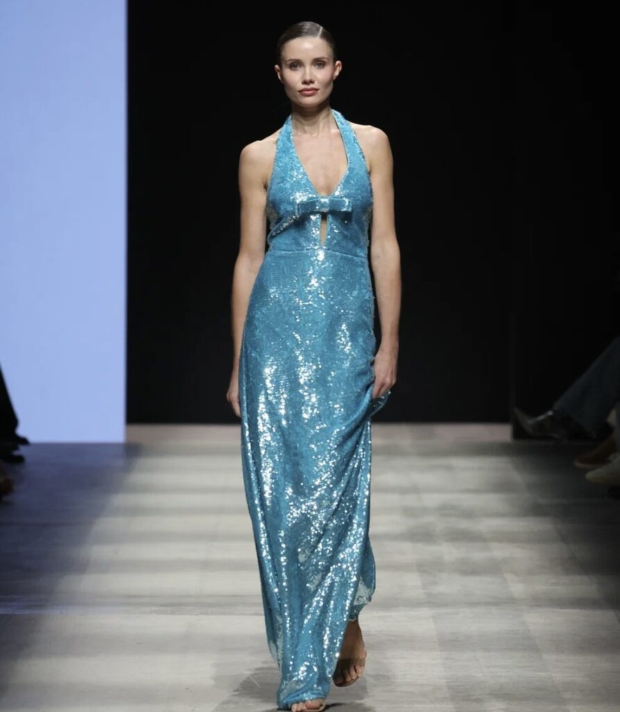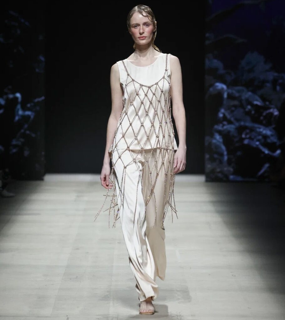 Лара Суровая, дизайнер модного дома, вдохновилась мифами о сиренах. Фактурные материалы напоминают волны и передают ощущение безграничного океана, светлые гаммы ассоциируются с лучами солнца, а мерцающие пайетки отсылают к чешуе. В линейке также встретились топы-ракушки, декорированные крупными пайетками, и сетки, накинутые поверх образа.