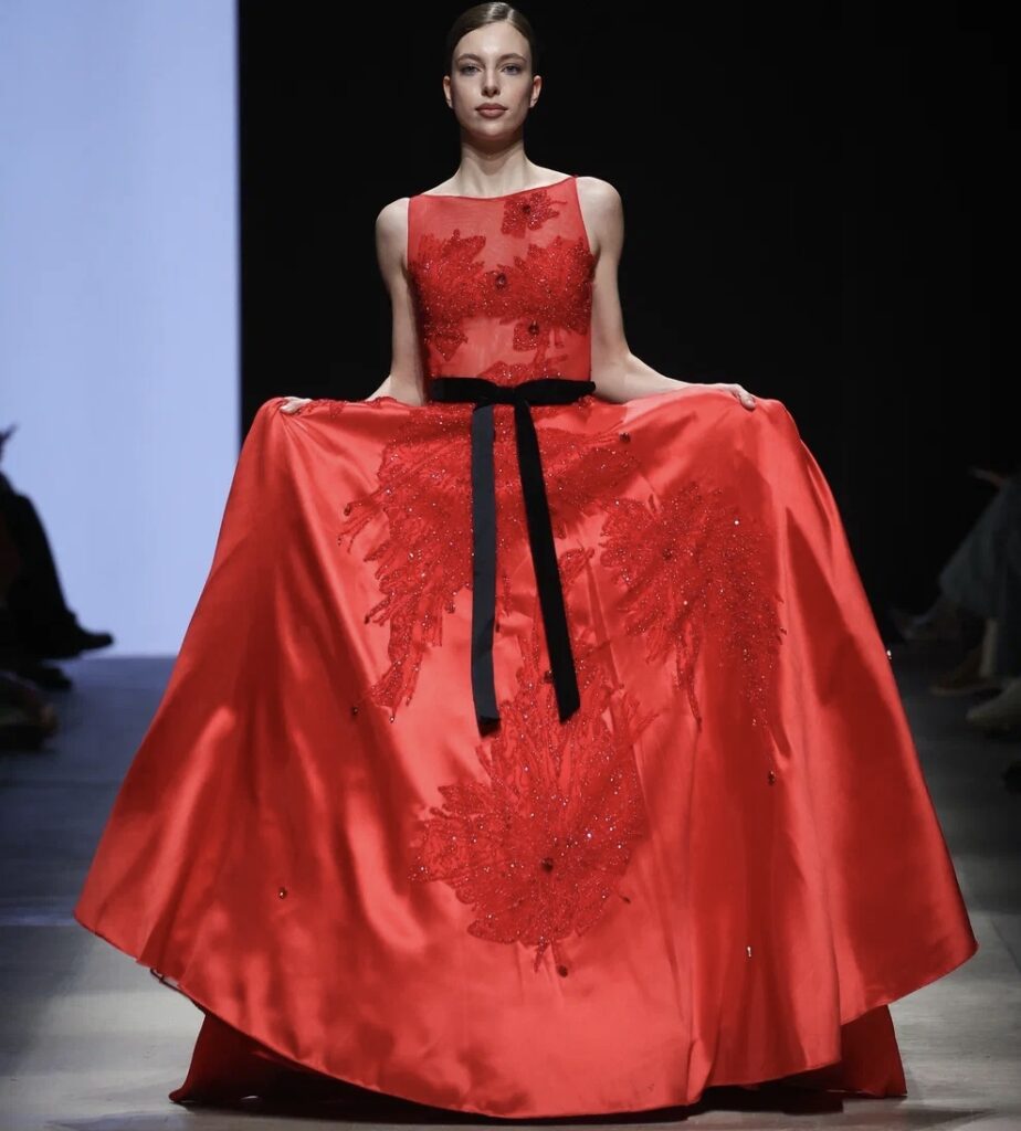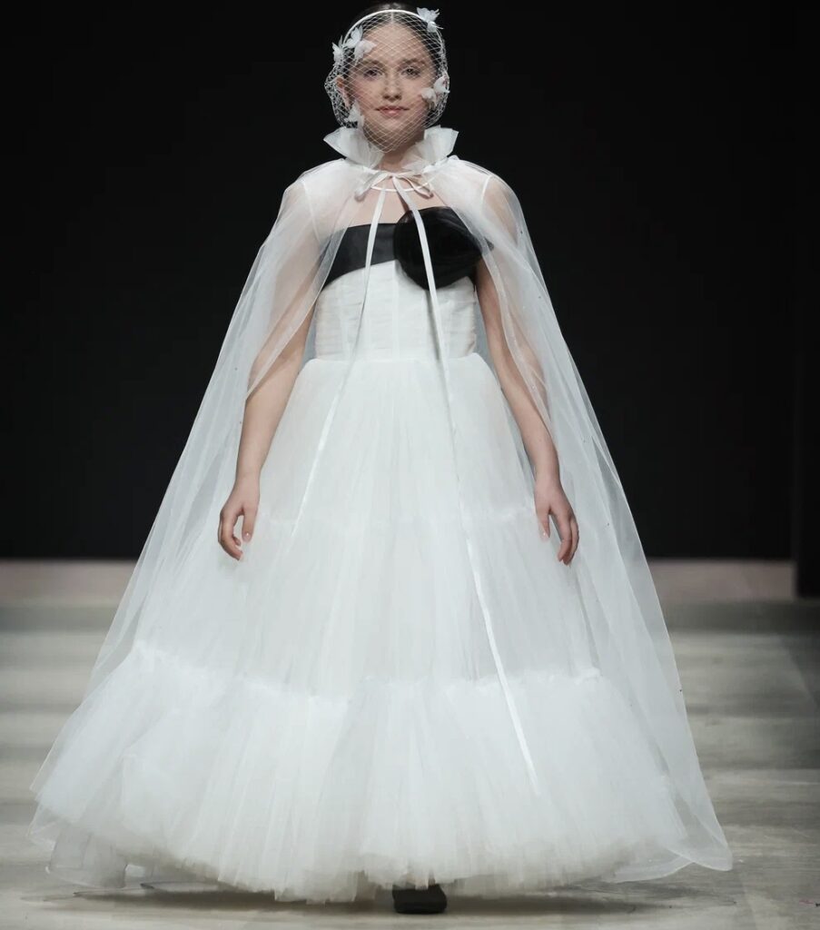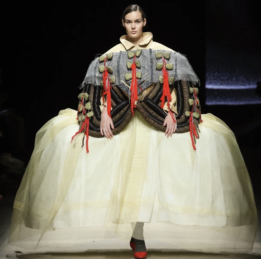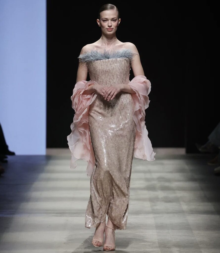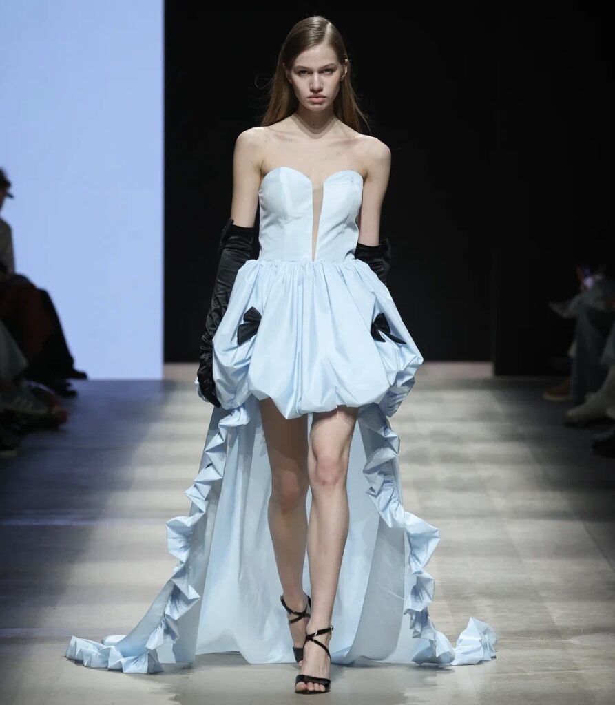В основе — архитектурность образов: приталенные корсеты, пышные юбки и объемные силуэты-баллоны. Палитра варьируется от небесно-голубого и нежно-розового до сливочного, с ярким дополнением фуксии, оранжевого и зеленого. Главный акцент сделан на ручную отделку. Отдельная деталь сезона — женские кожаные тренчи в голубом, черном и розовом исполнении: с отделкой из лисы или в минималистичном варианте.