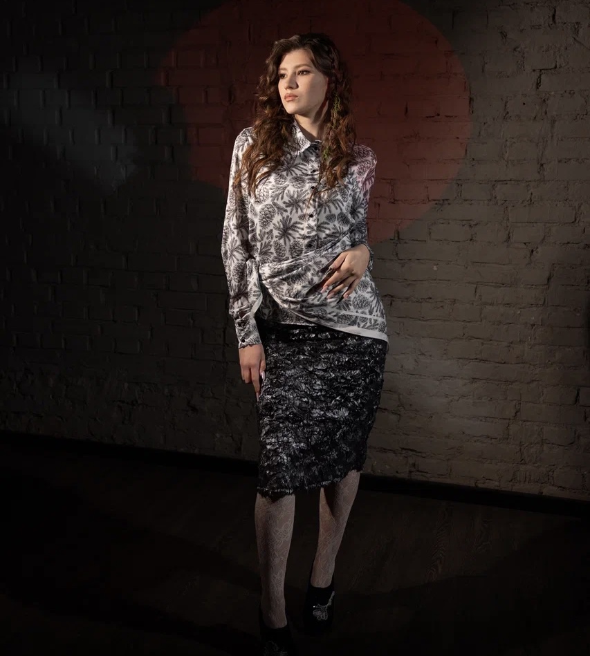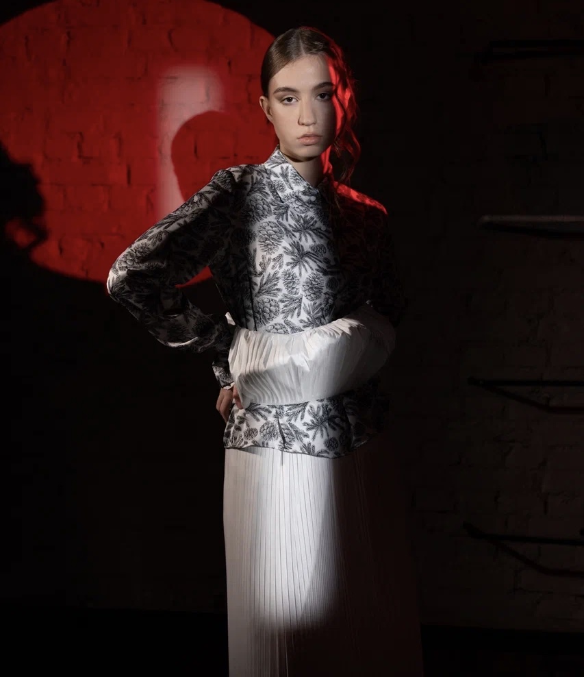 Студенты воссоздали образы четырех сословий: дворянства с европейским кроем, купечества в ярких фактурах, практичного мещанства и крестьянства с архаичным орнаментом. Визуальной метафорой показа стали фольклорные расшитые образы, сменяющиеся пепельно-темными силуэтами — словно догоревшее масленичное чучело.