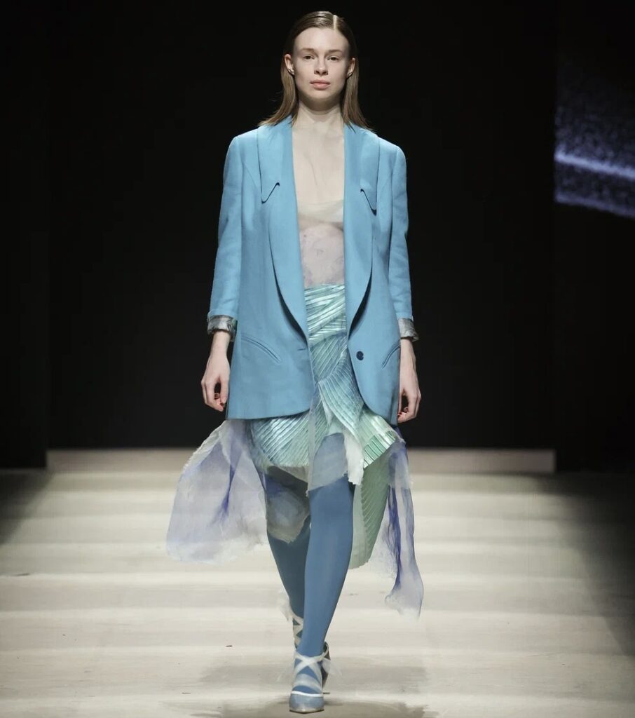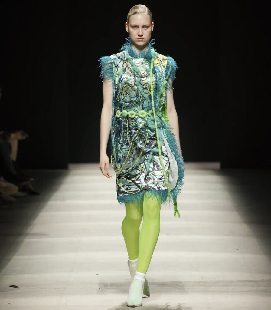 Ее визуальный язык строится на игре текстур: перья, бахрома, сетка и полупрозрачные ткани соседствуют с плотными материалами, создавая эффект живых, непрерывно меняющихся форм. Асимметрия, необработанные края и деконструкция подчеркивают мотивы движения и роста. Палитра объединяет мягкие пастельные тона с темными акцентами. Силуэты меняются от приталенных до многослойных.