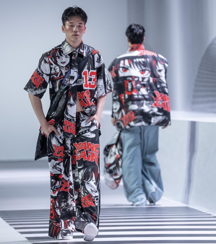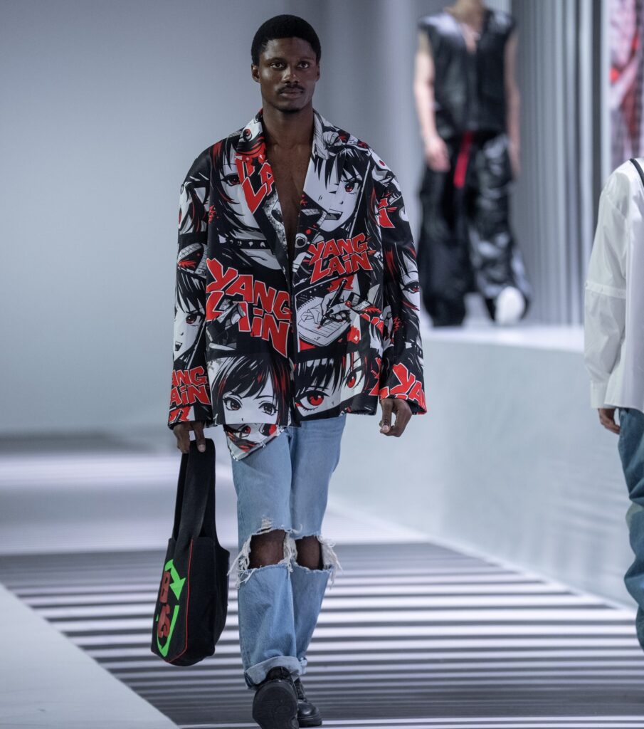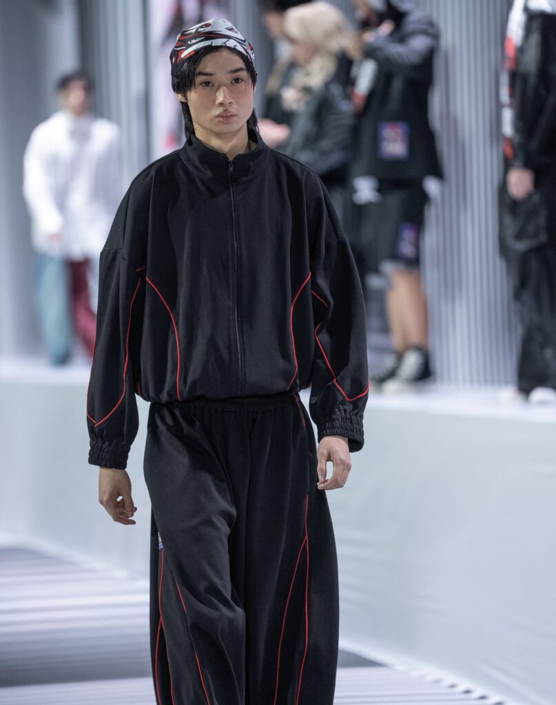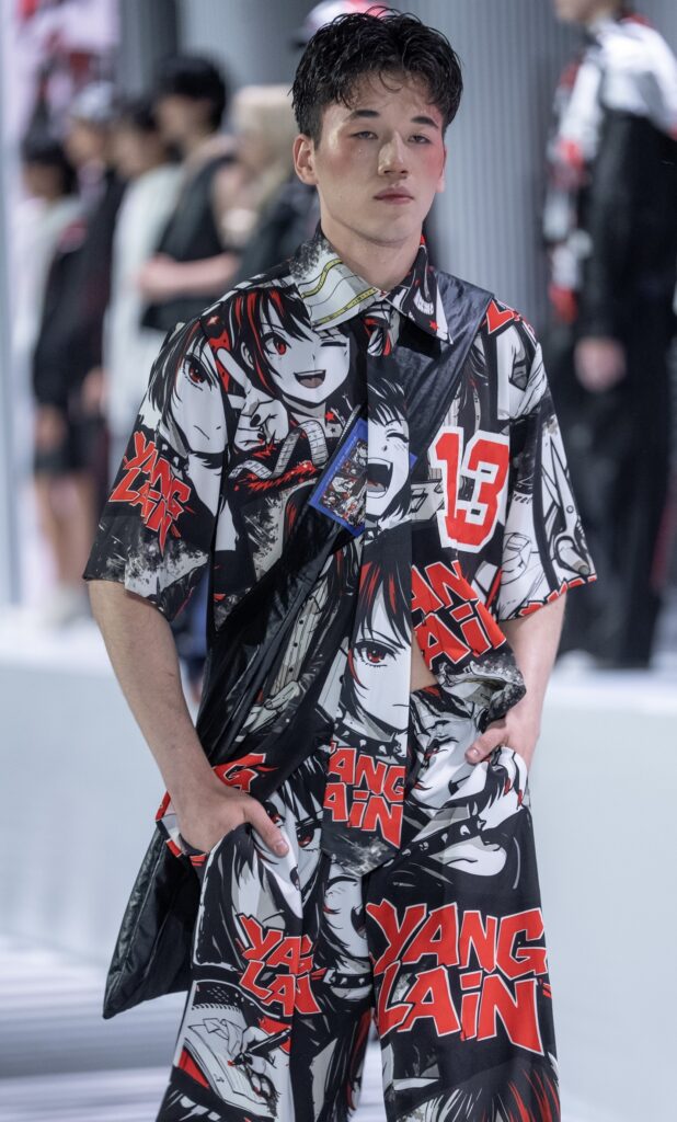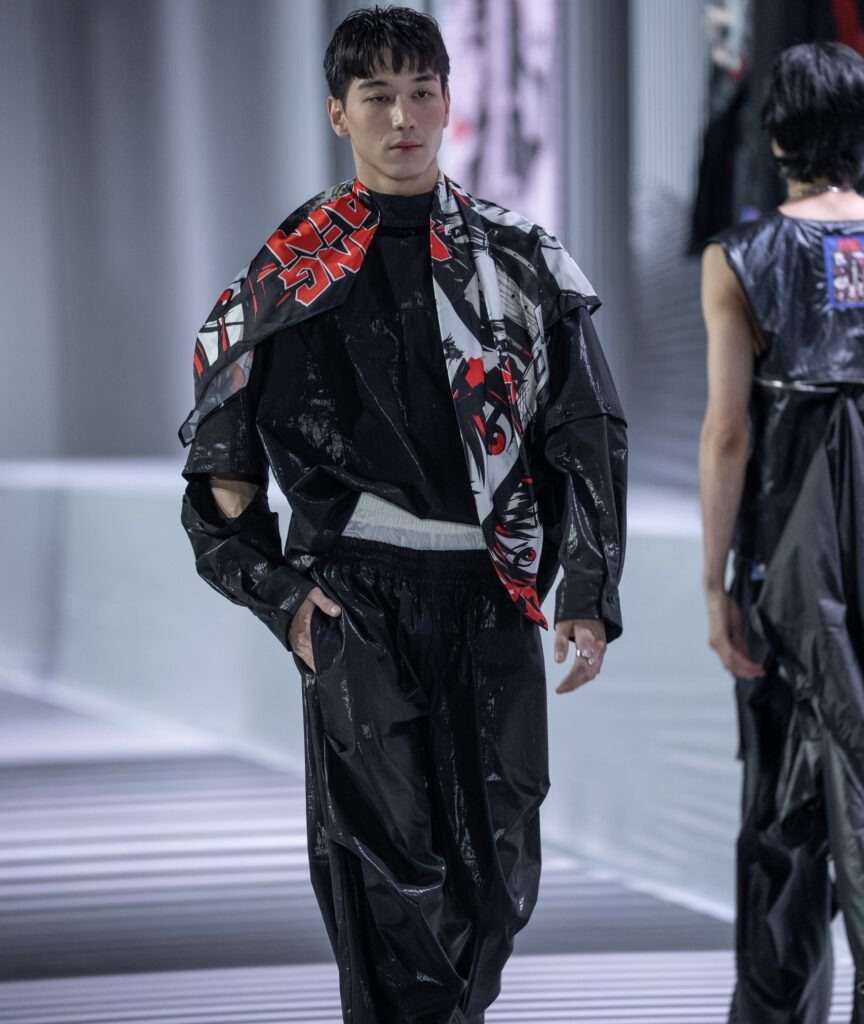 Ключевым элементом становится авторский принт в эстетике манги, созданный дизайнером вручную и отражающий личный путь бренда. Цветовая палитра строится на контрасте чёрного и красного, усиливая выразительность коллекции