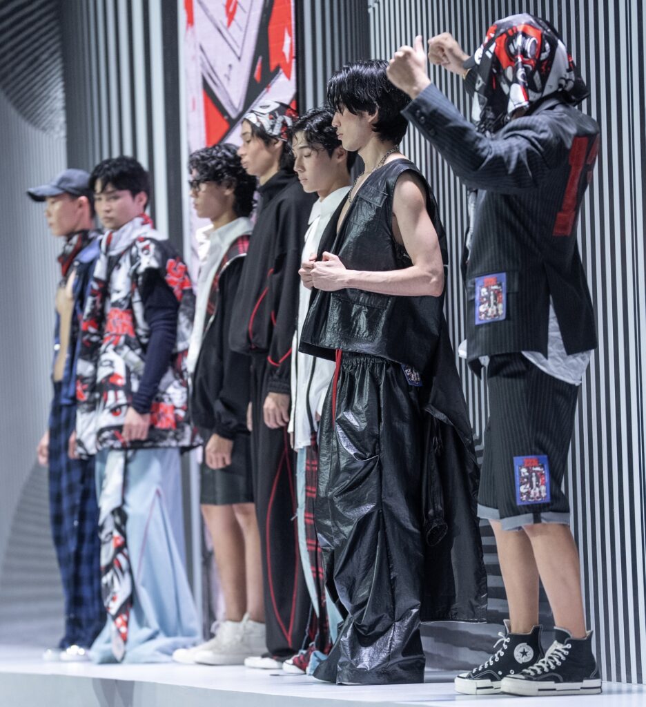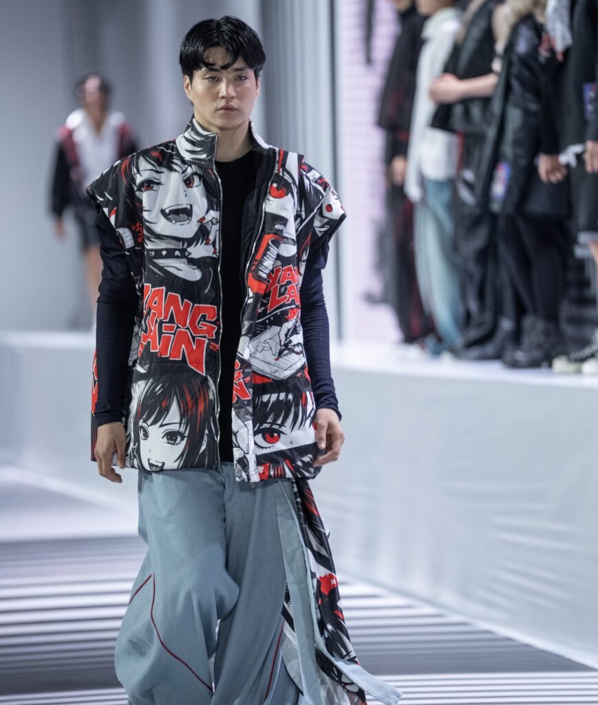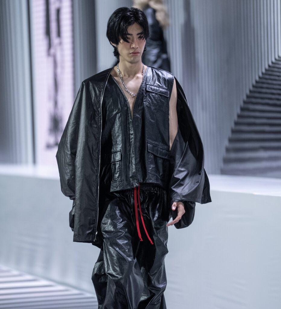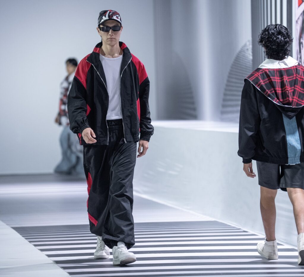 Ключевым элементом становится авторский принт в эстетике манги, созданный дизайнером вручную и отражающий личный путь бренда. Цветовая палитра строится на контрасте чёрного и красного, усиливая выразительность коллекции