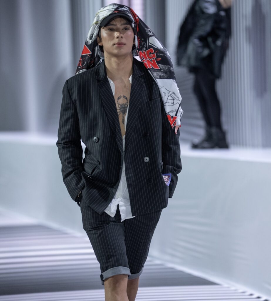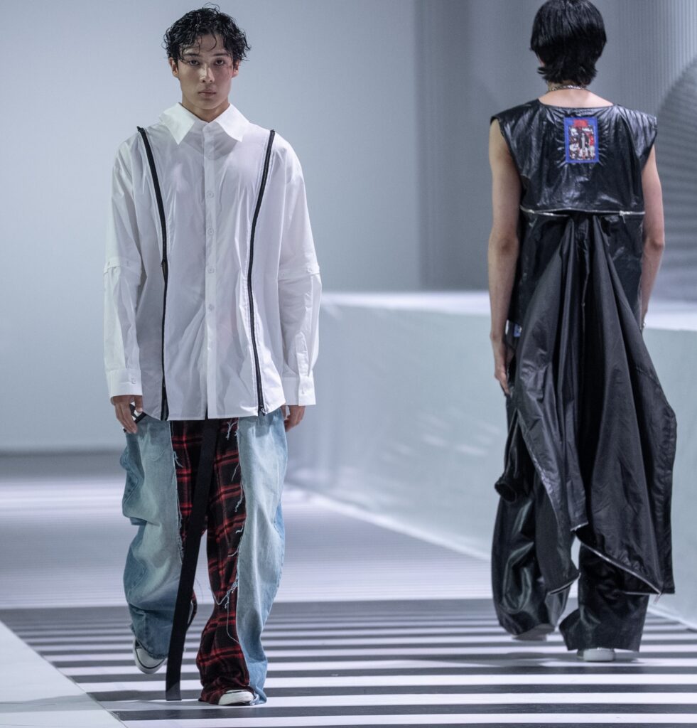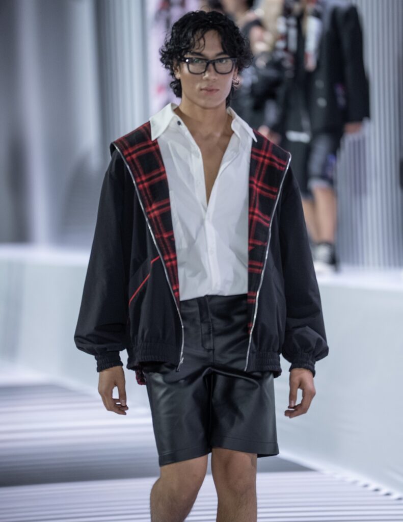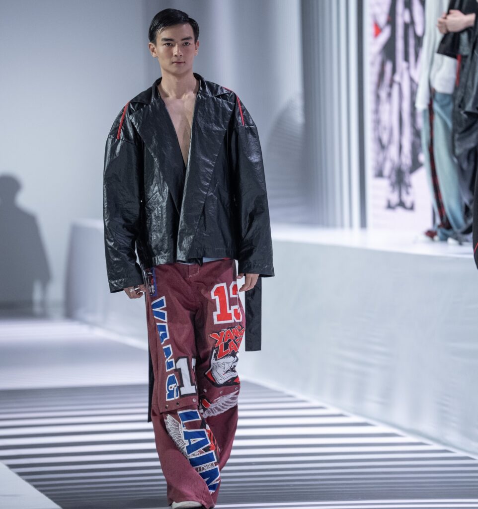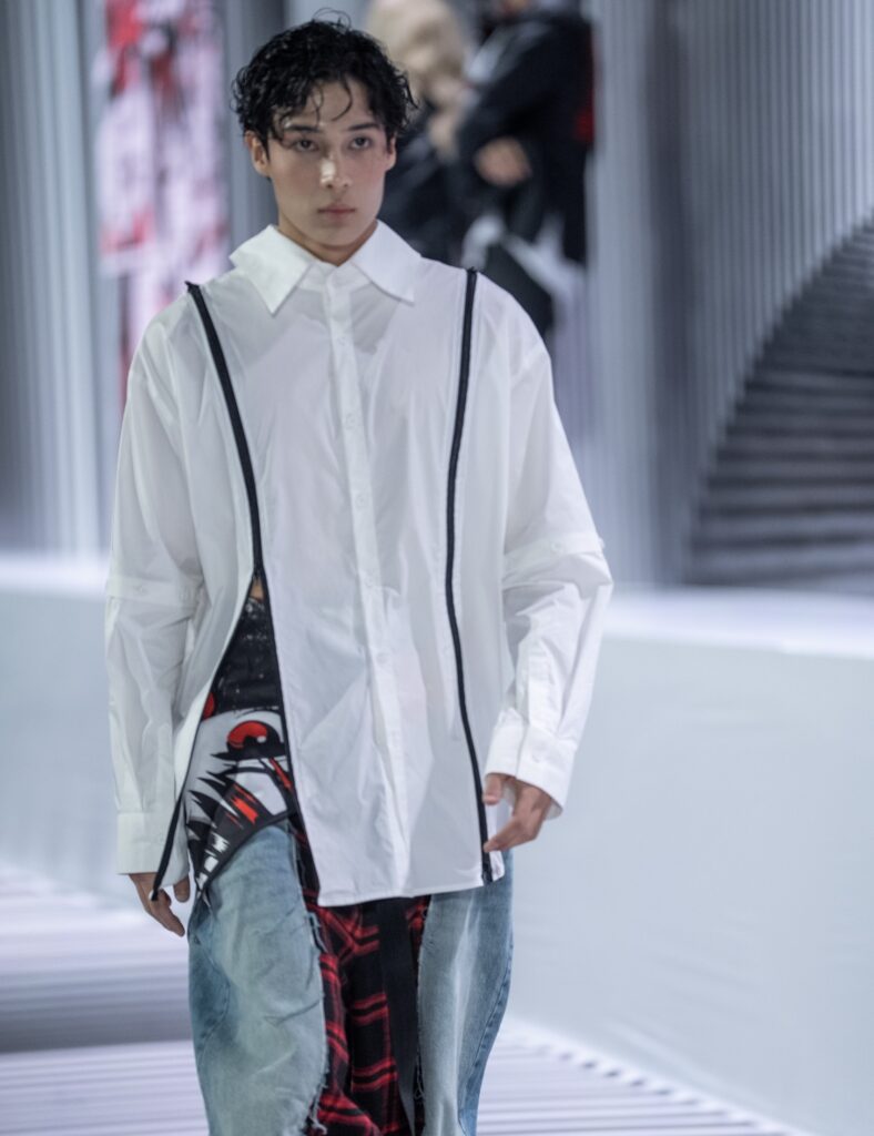 Ключевым элементом становится авторский принт в эстетике манги, созданный дизайнером вручную и отражающий личный путь бренда. Цветовая палитра строится на контрасте чёрного и красного, усиливая выразительность коллекции