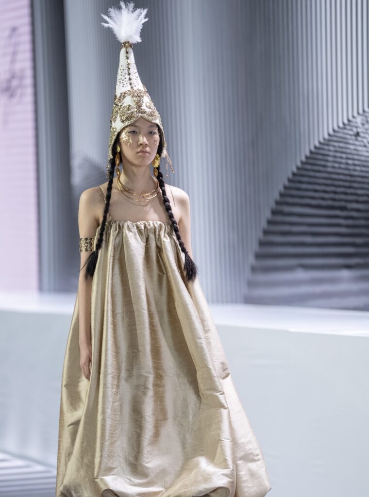Коллекция «Легенды Кочевников» обращается к теме внутренней свободы и культурной памяти. Образы строятся на текучих, многослойных силуэтах и природной цветовой палитре — от песочных и травяных оттенков до глубокого чёрного. Это не реконструкция прошлого, а его переосмысление, в котором ощущаются движение, пространство и связь с корнями