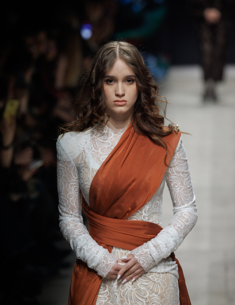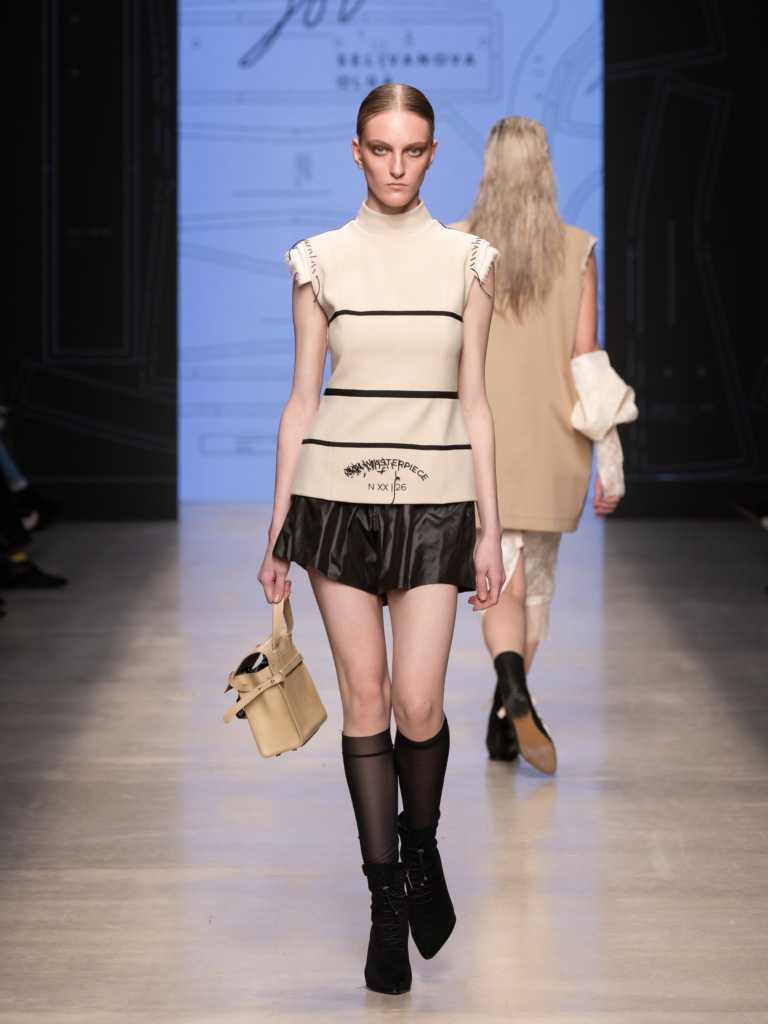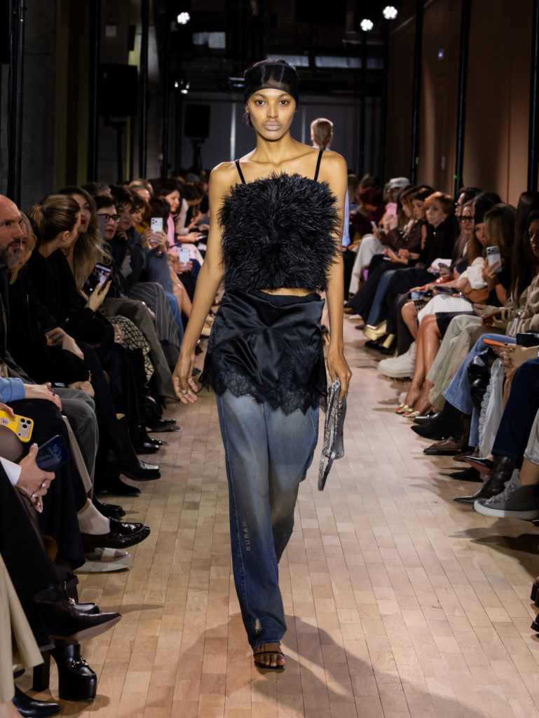 В пространстве Noôdome на 7 этаже в Романовом переулке состоялся показ бренда RUBAN в рамках Московской недели моды, который представил коллекцию сезона осень-зима 2026-2027. Тонкая органза сочетается с грубой потертой кожей. Появились новые цвета и оттенки, которые бренд не использовал раньше: куртка из бронзовой кожи или юбка, покрытая золотыми перьями.