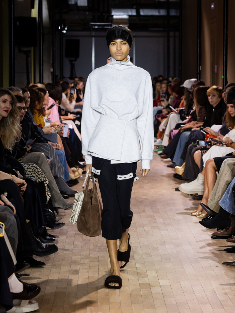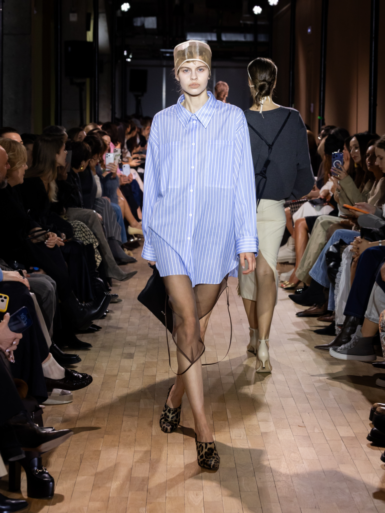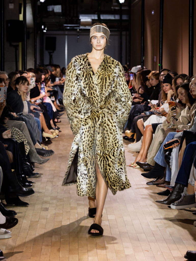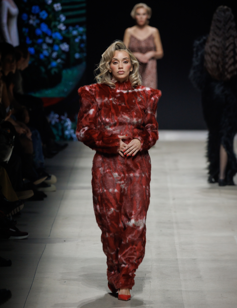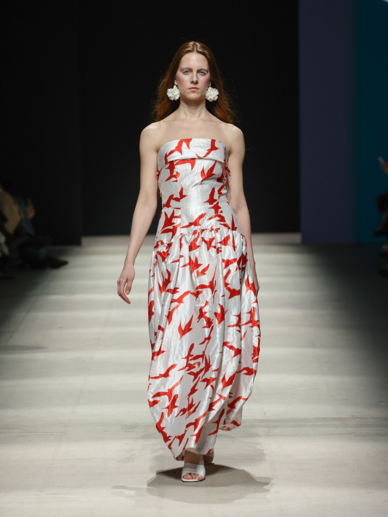 За нежностью материала просыпается анималистика: клетка сменяется горохом, а сдержанную цветовую гамму — бежевый, серый и черный — разбавляет ярко-красный. Образы гармонично дополнялись обувью от официального обувного партнера Московской недели моды — бренда O’SHADE.