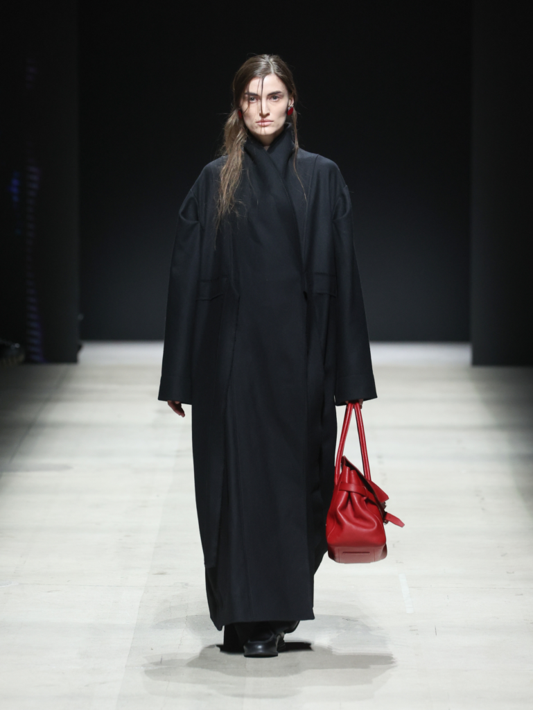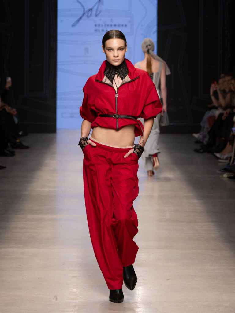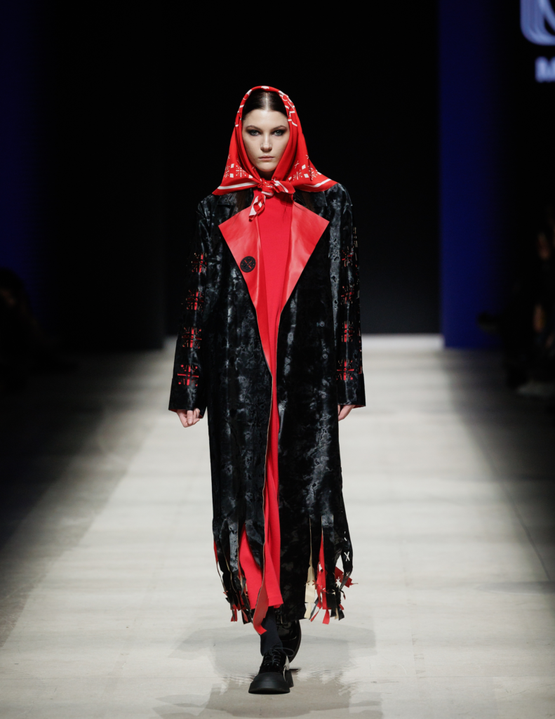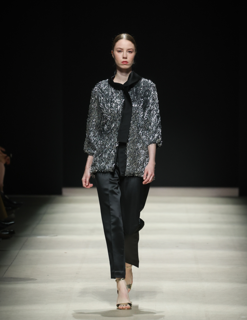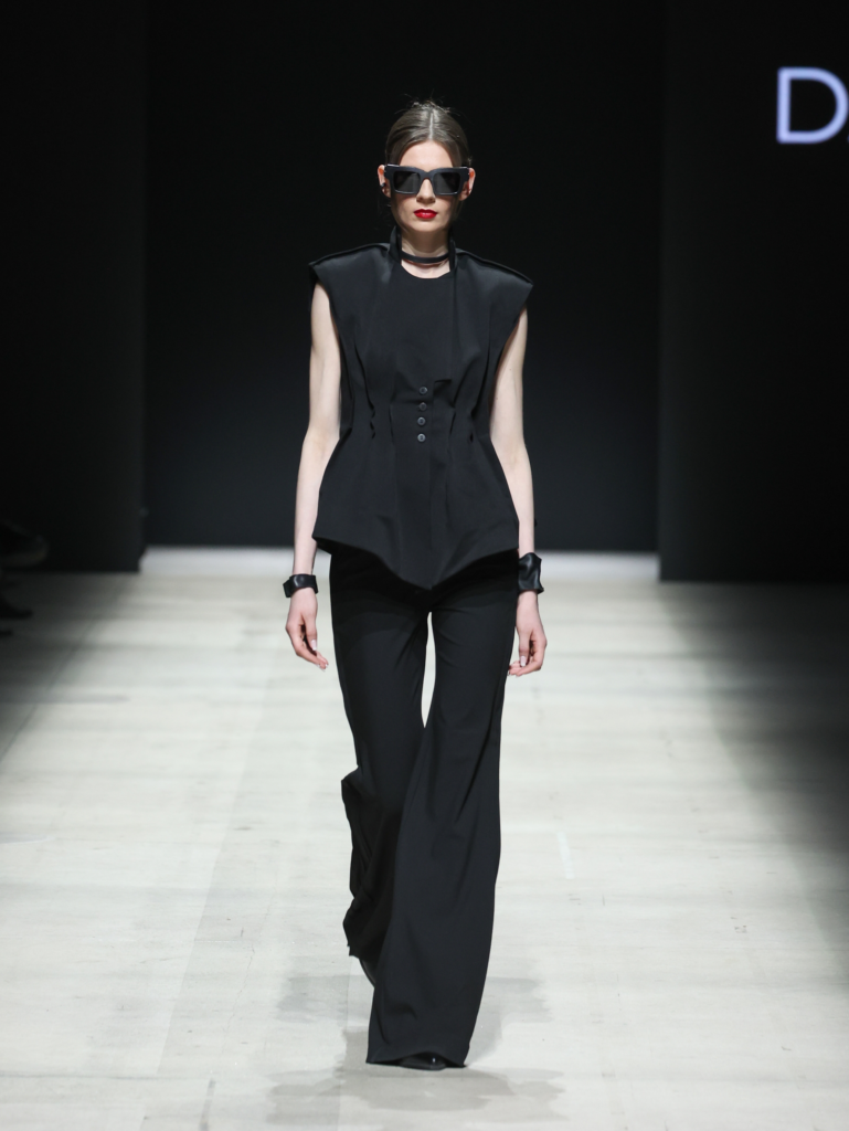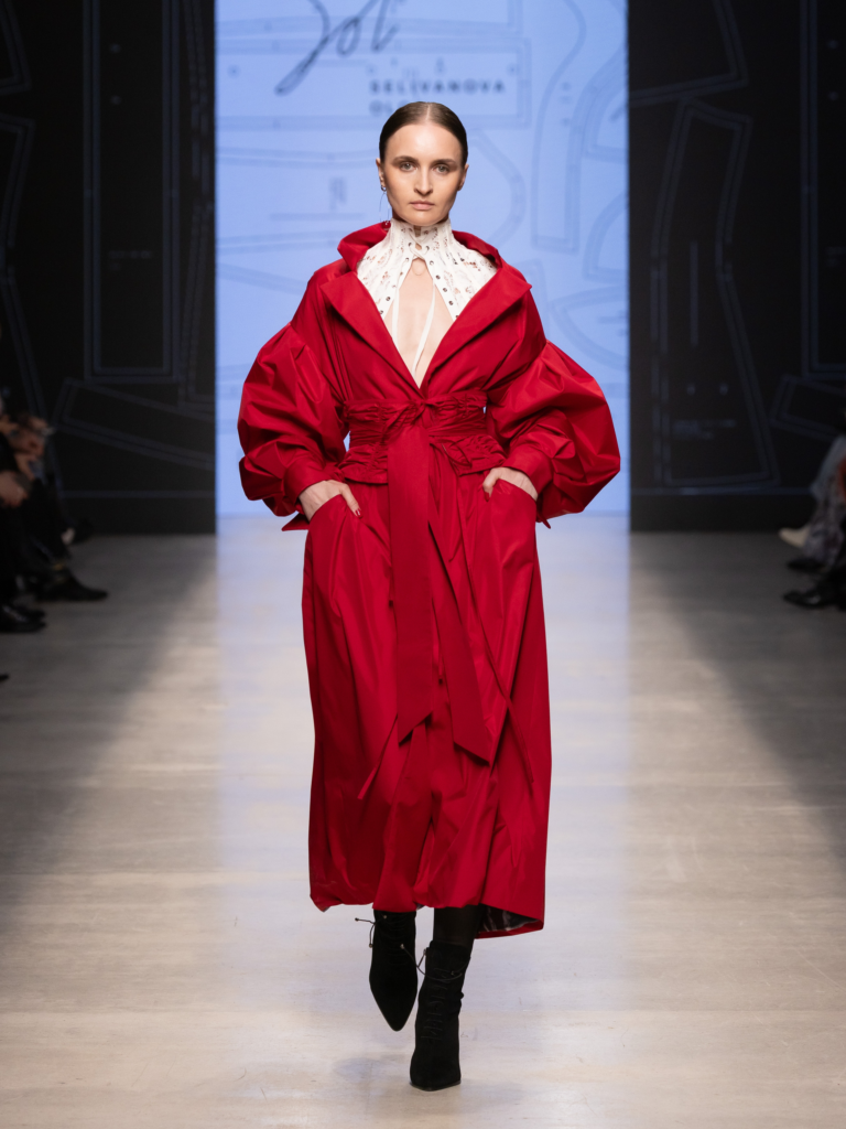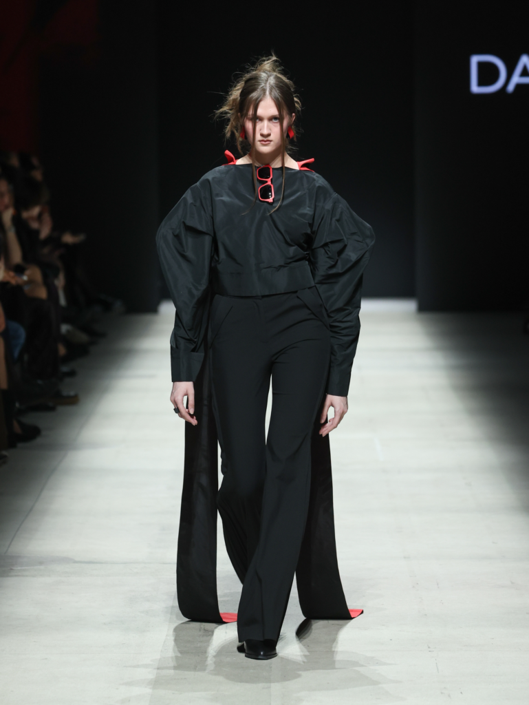 Главные цвета коллекции — черный и красный. Ключевым акцентом коллекции стали приталенные силуэты. Образы гармонично дополнялись обувью от официального обувного партнера Московской недели моды — бренда O’SHADE.