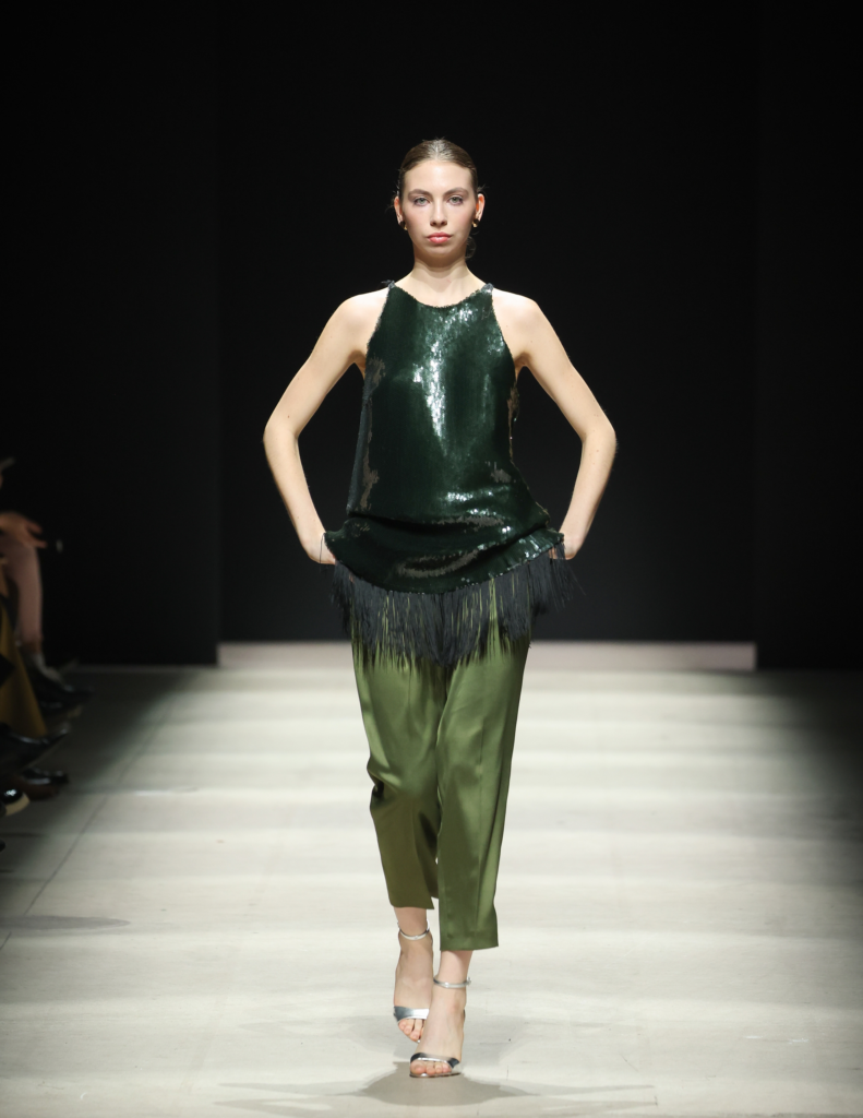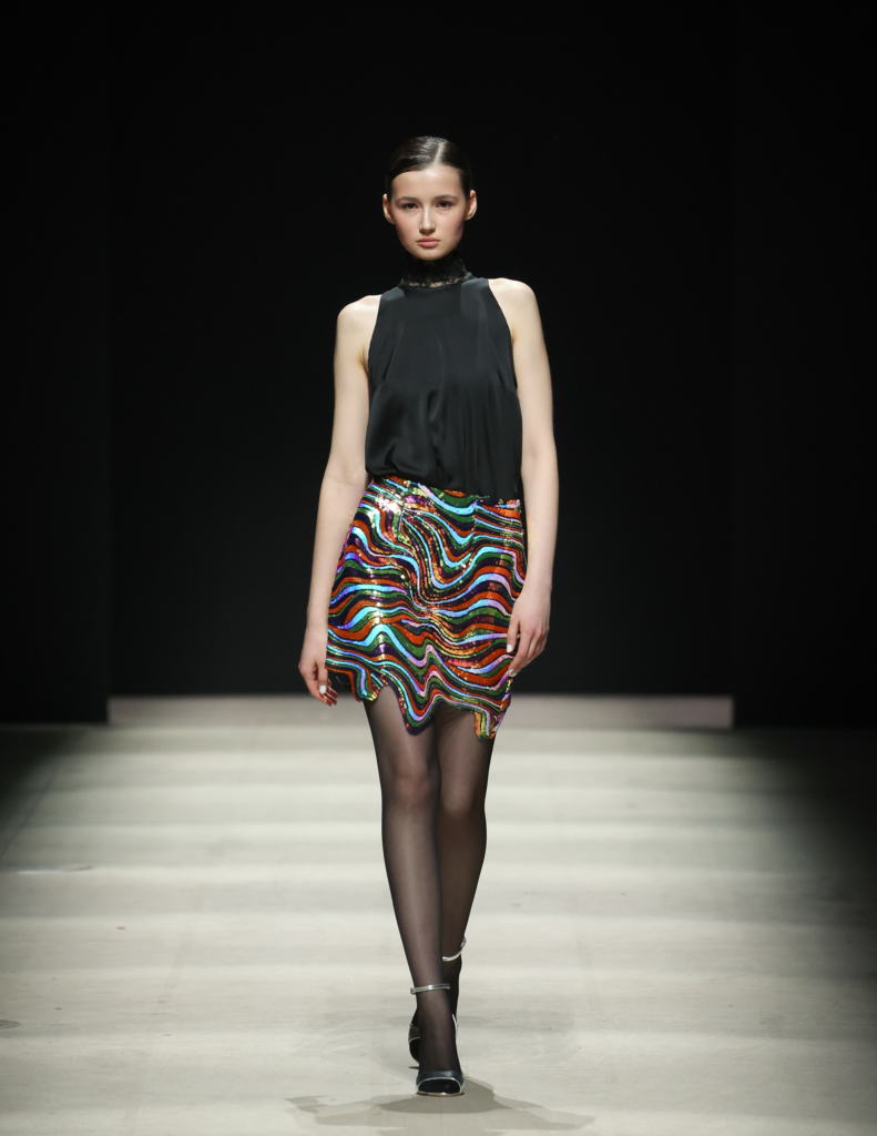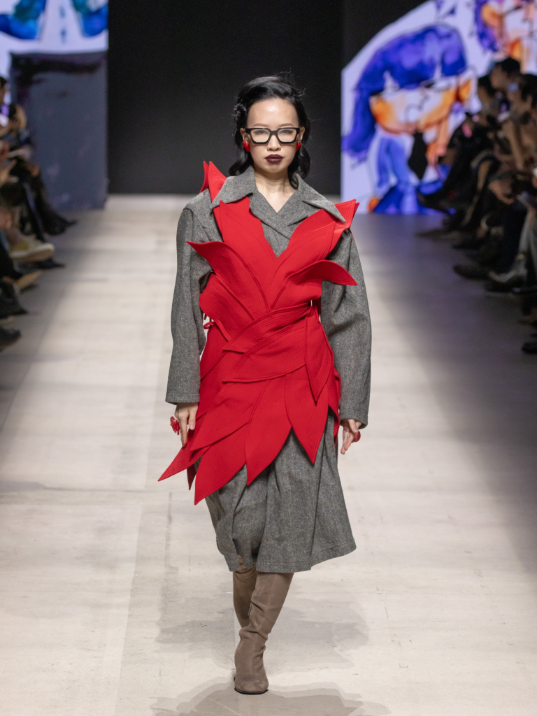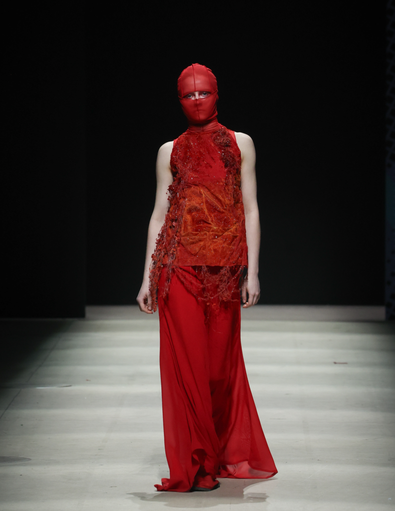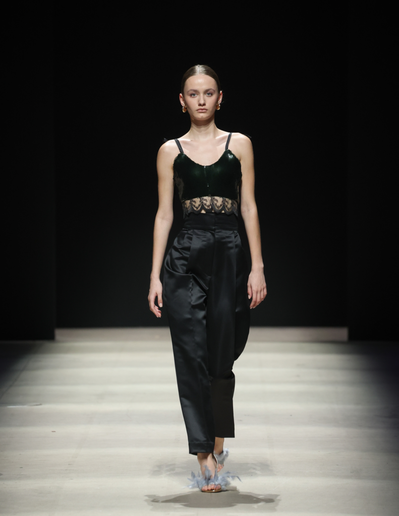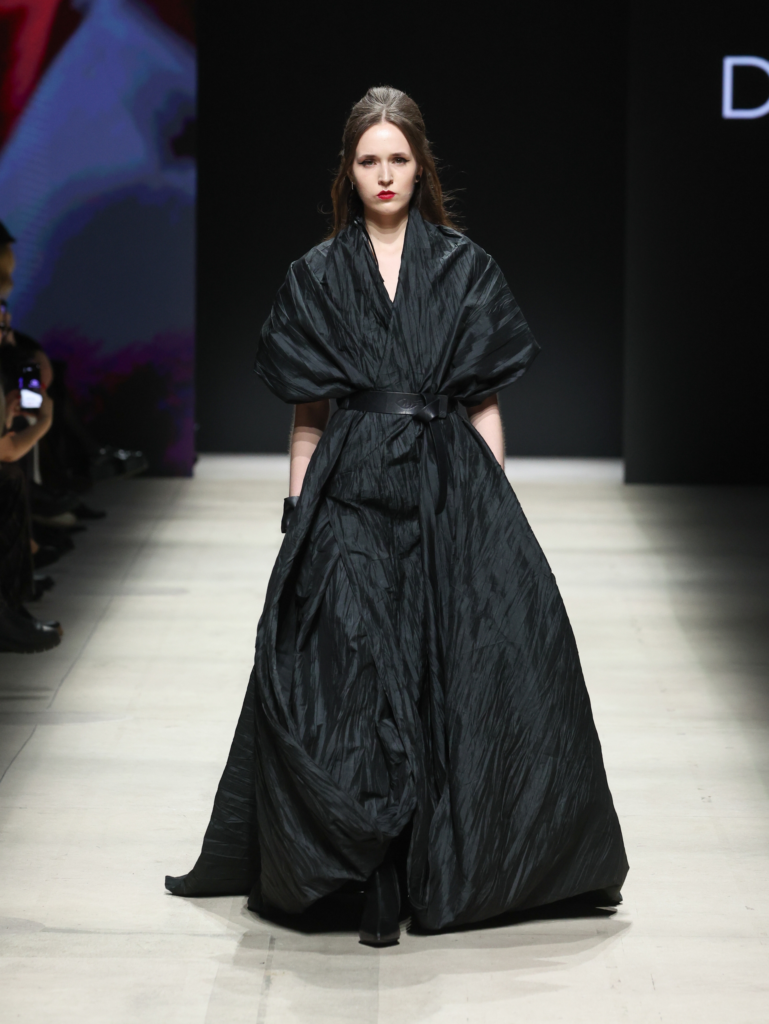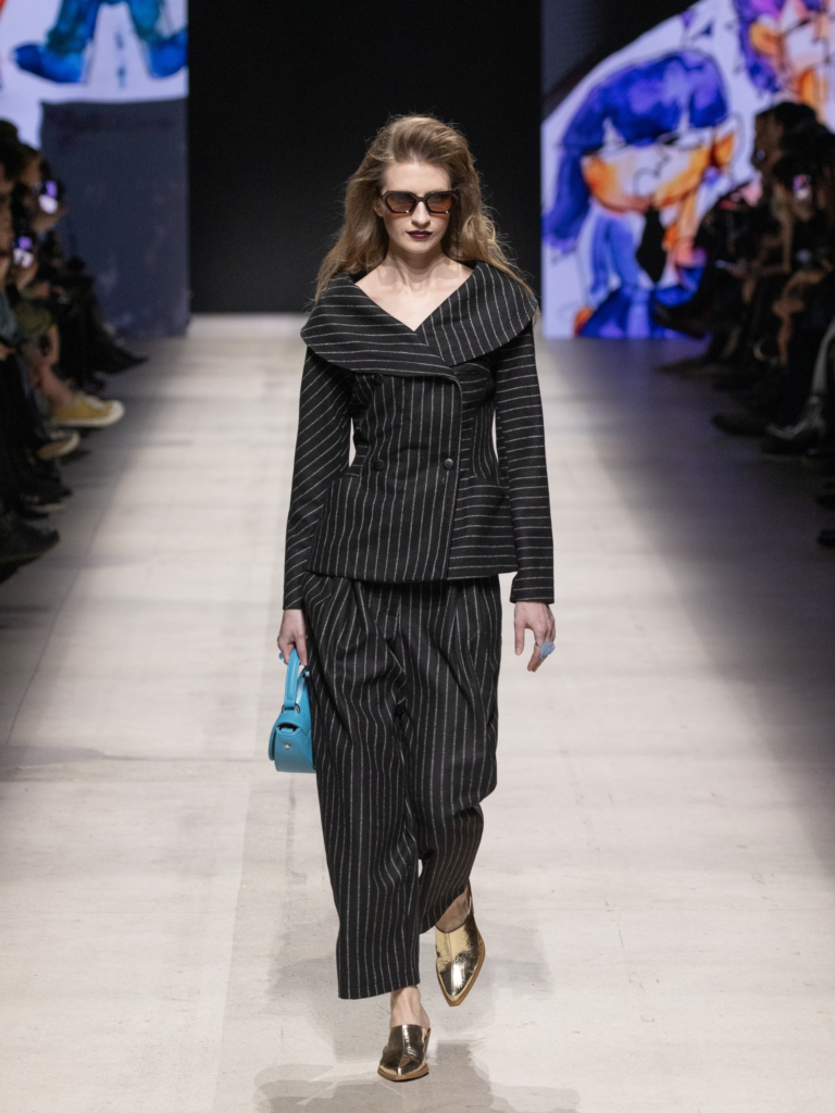 Главные цвета коллекции — черный и красный. Ключевым акцентом коллекции стали приталенные силуэты. Образы гармонично дополнялись обувью от официального обувного партнера Московской недели моды — бренда O’SHADE.