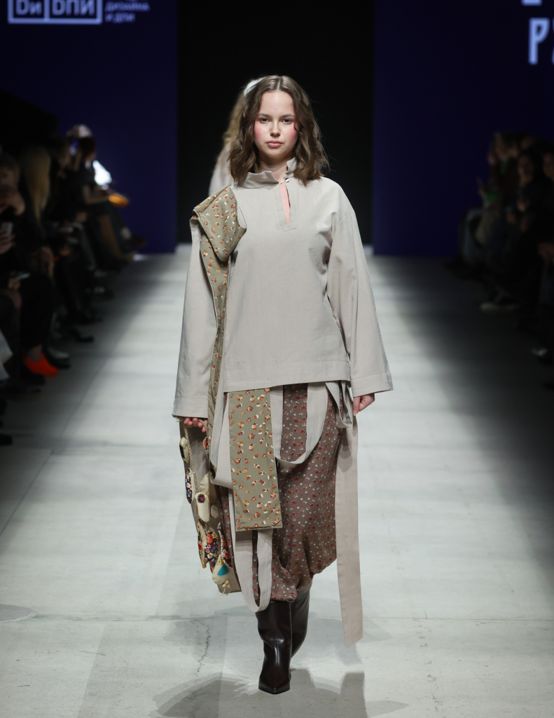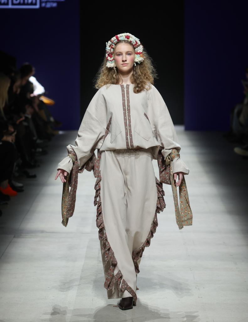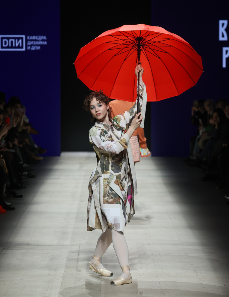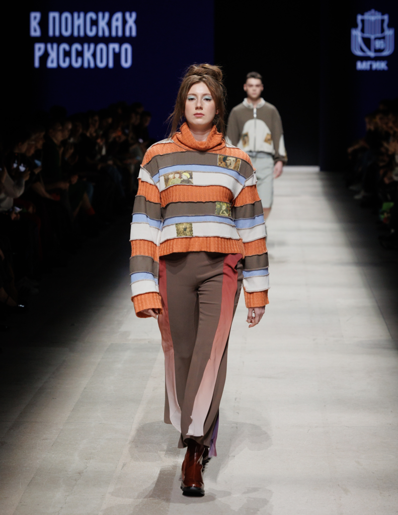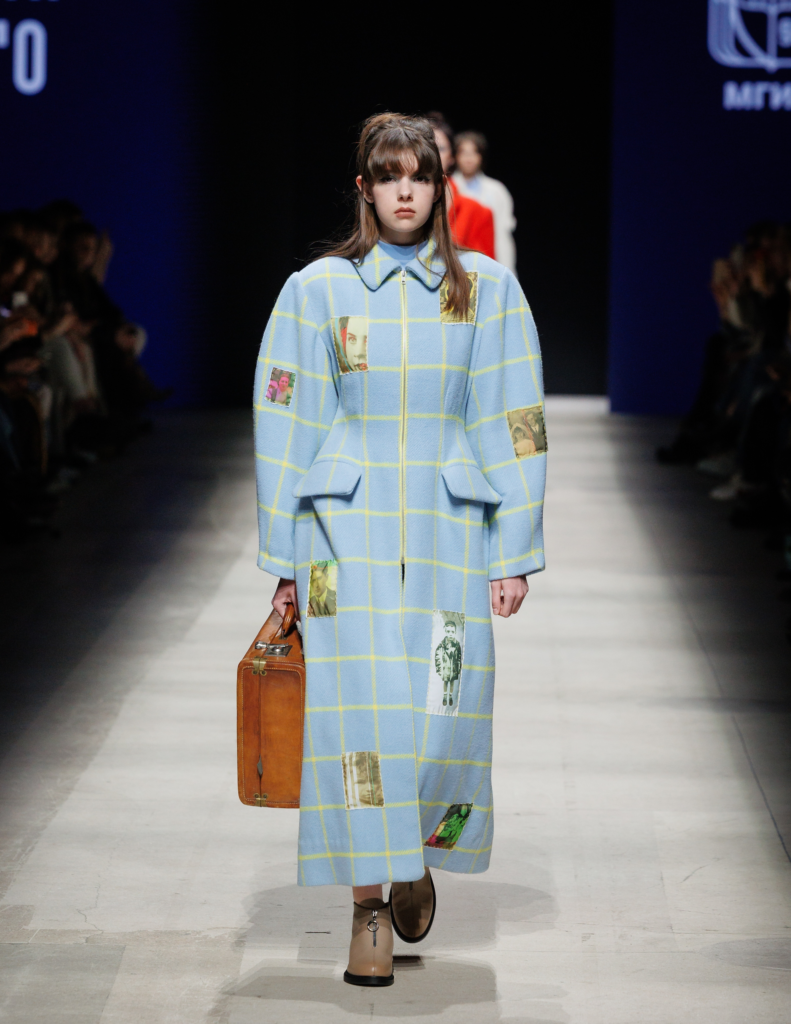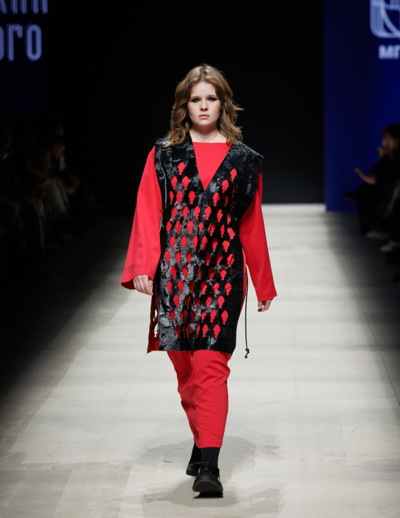 Показ был разделен на 8 блоков: среди них коллекции «Филимоново.Style», в основу которой легла традиционная Филимоновская глиняная игрушка, «Жили-были кони красные», посвященной Мезенской росписи, «Архитектура: Московская линия» об эстетике зданий русского модерна и московского конструктивизма. Также на подиуме мы увидели изделия из линейки «Альбом моей бабушки», «Русская душа», «Хтонь», «Забава», «Иван Купала». Образы студентов дополнялись обувью от бренда O’SHADE, официального обувного партнера Московской недели моды.