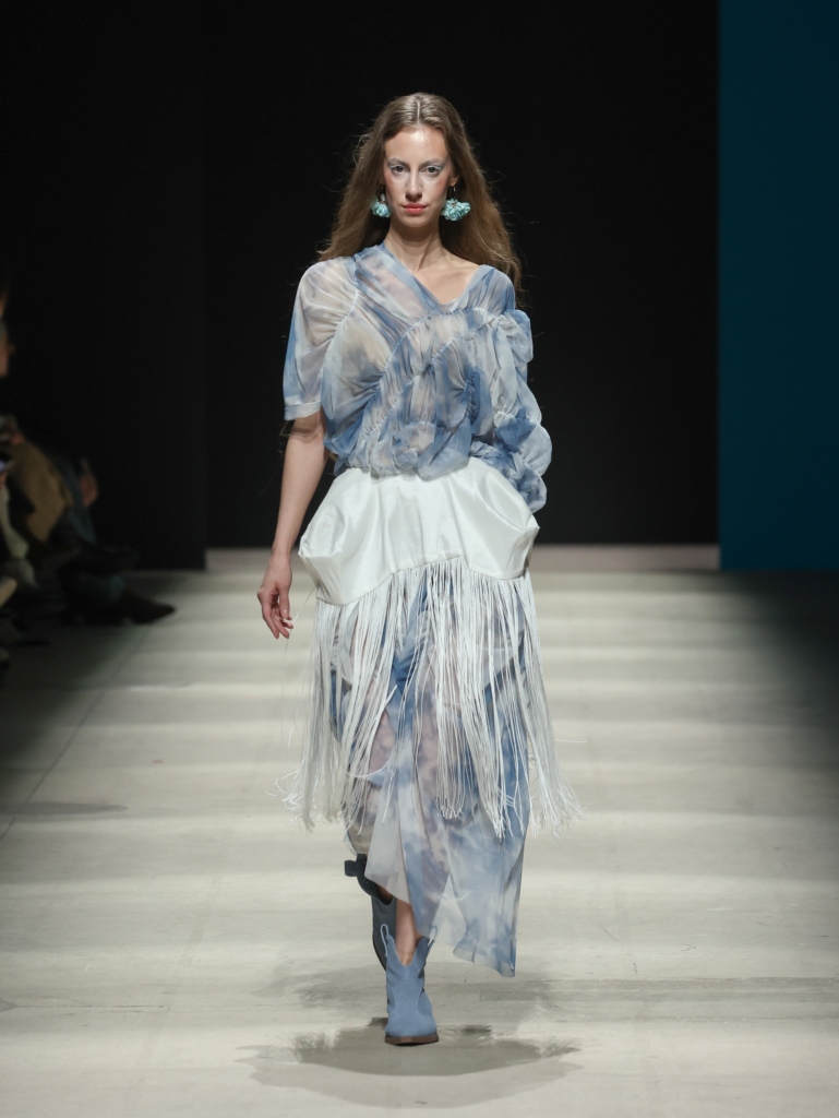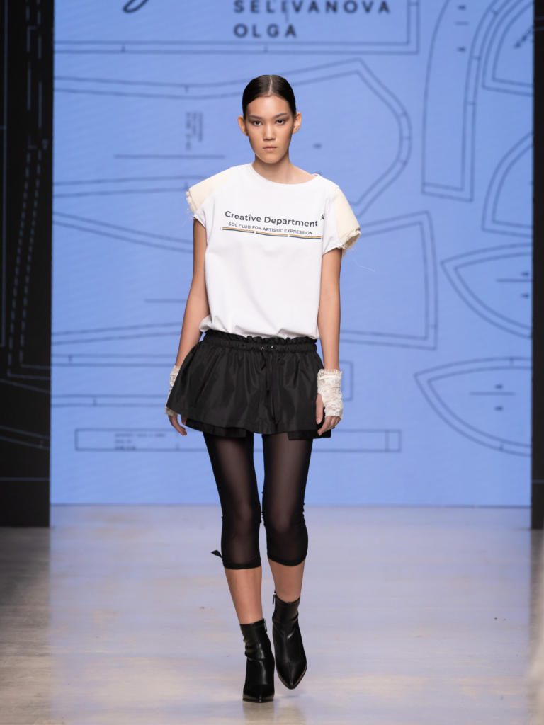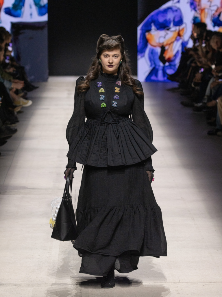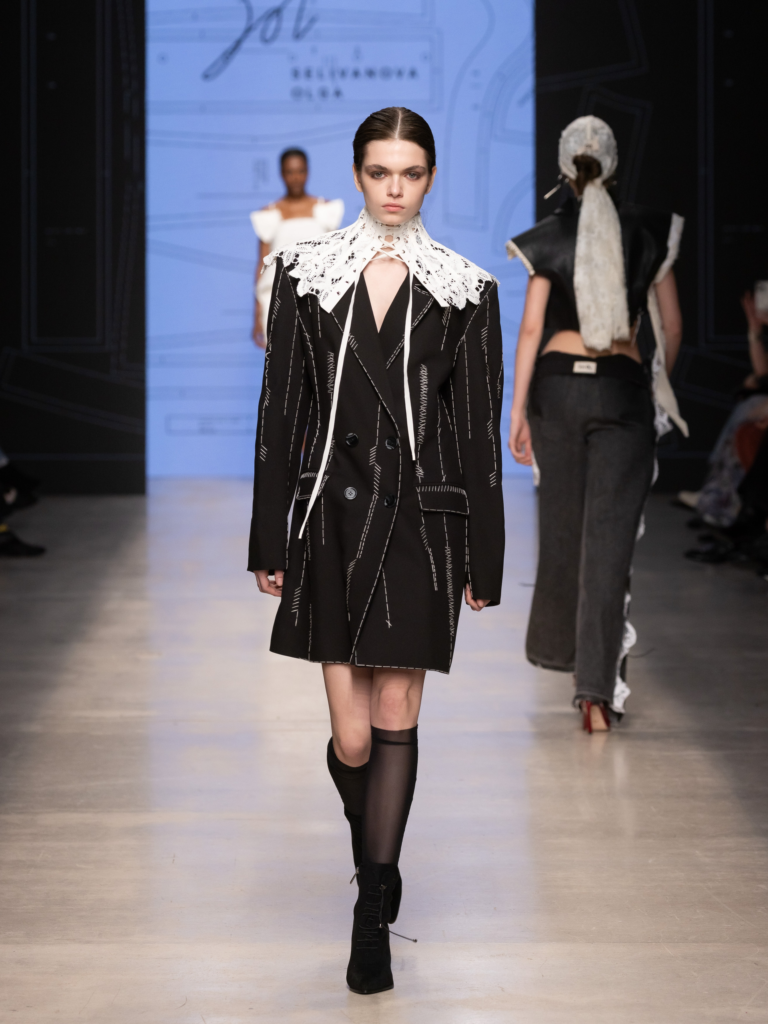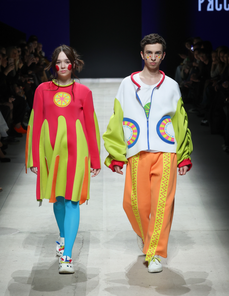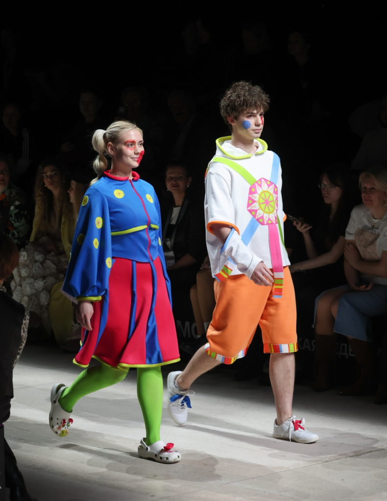 Показ был разделен на 8 блоков: среди них коллекции «Филимоново.Style», в основу которой легла традиционная Филимоновская глиняная игрушка, «Жили-были кони красные», посвященной Мезенской росписи, «Архитектура: Московская линия» об эстетике зданий русского модерна и московского конструктивизма. Также на подиуме мы увидели изделия из линейки «Альбом моей бабушки», «Русская душа», «Хтонь», «Забава», «Иван Купала». Образы студентов дополнялись обувью от бренда O’SHADE, официального обувного партнера Московской недели моды.