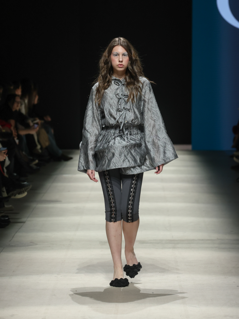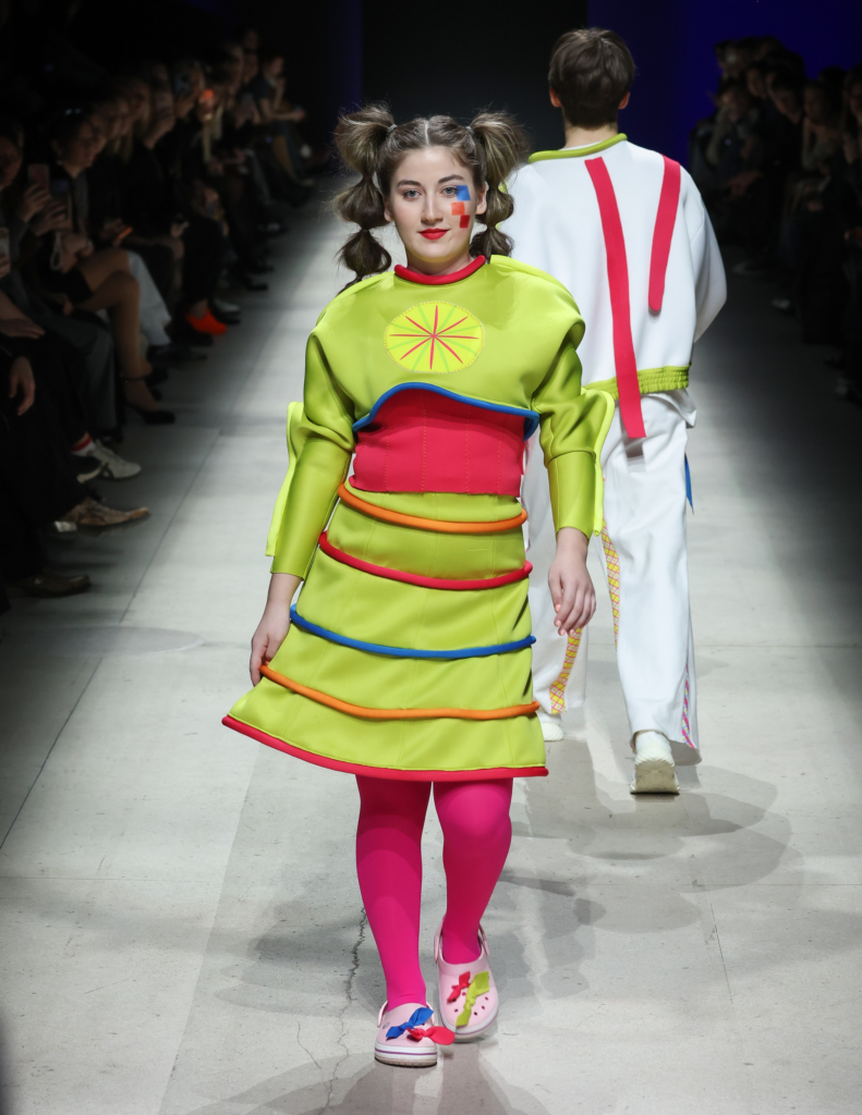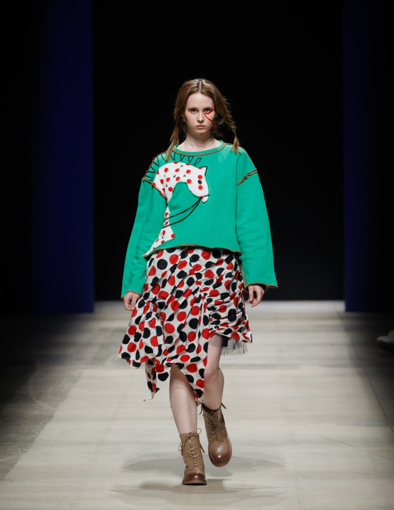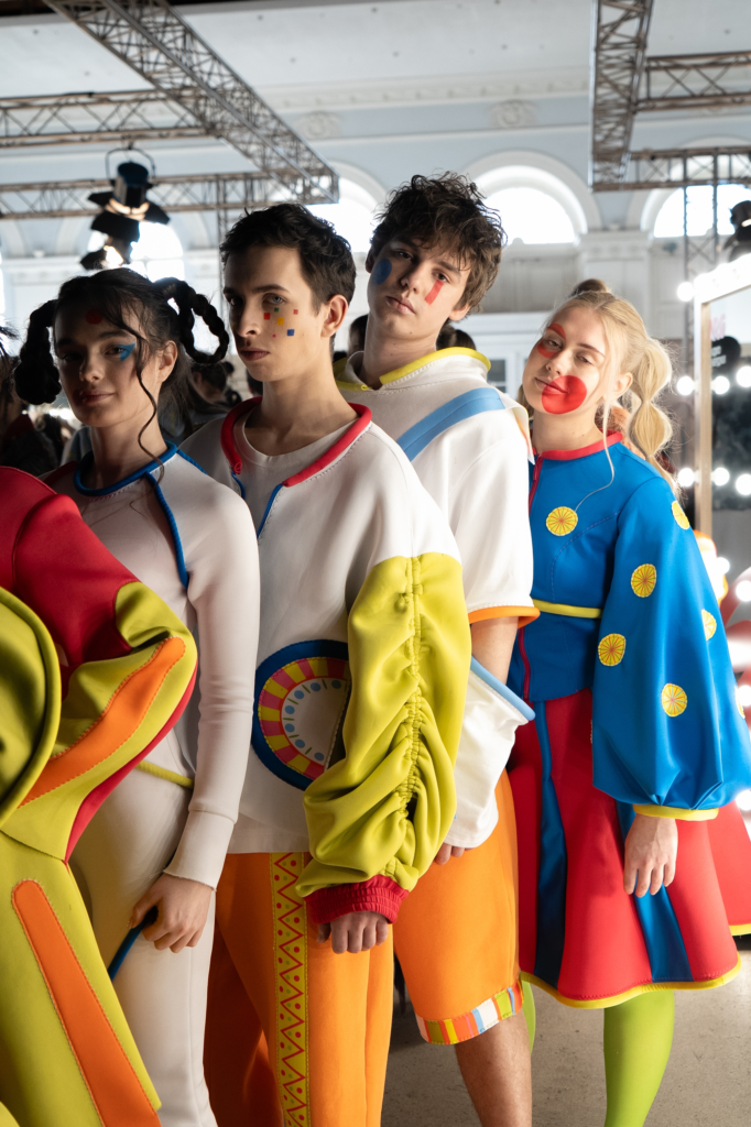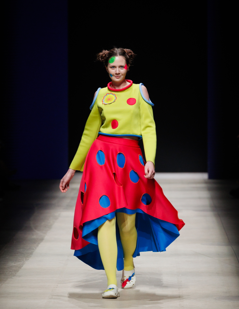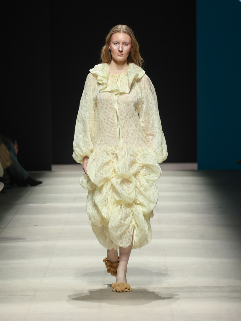 Показ был разделен на 8 блоков: среди них коллекции «Филимоново.Style», в основу которой легла традиционная Филимоновская глиняная игрушка, «Жили-были кони красные», посвященной Мезенской росписи, «Архитектура: Московская линия» об эстетике зданий русского модерна и московского конструктивизма. Также на подиуме мы увидели изделия из линейки «Альбом моей бабушки», «Русская душа», «Хтонь», «Забава», «Иван Купала». Образы студентов дополнялись обувью от бренда O’SHADE, официального обувного партнера Московской недели моды.