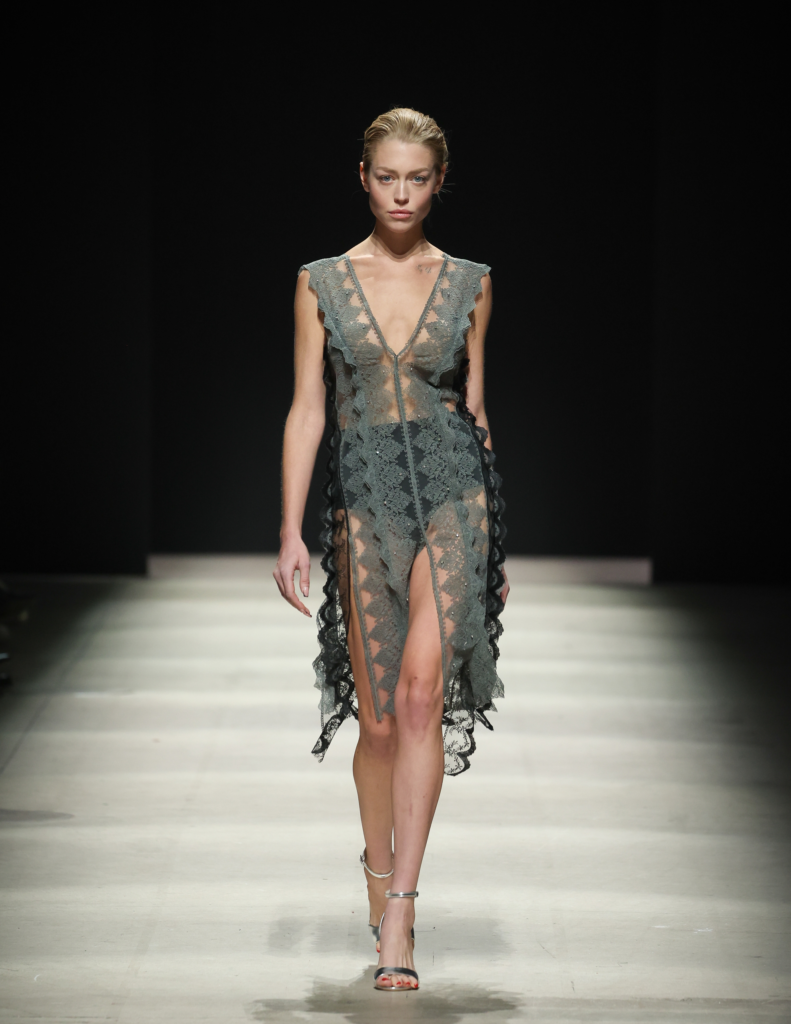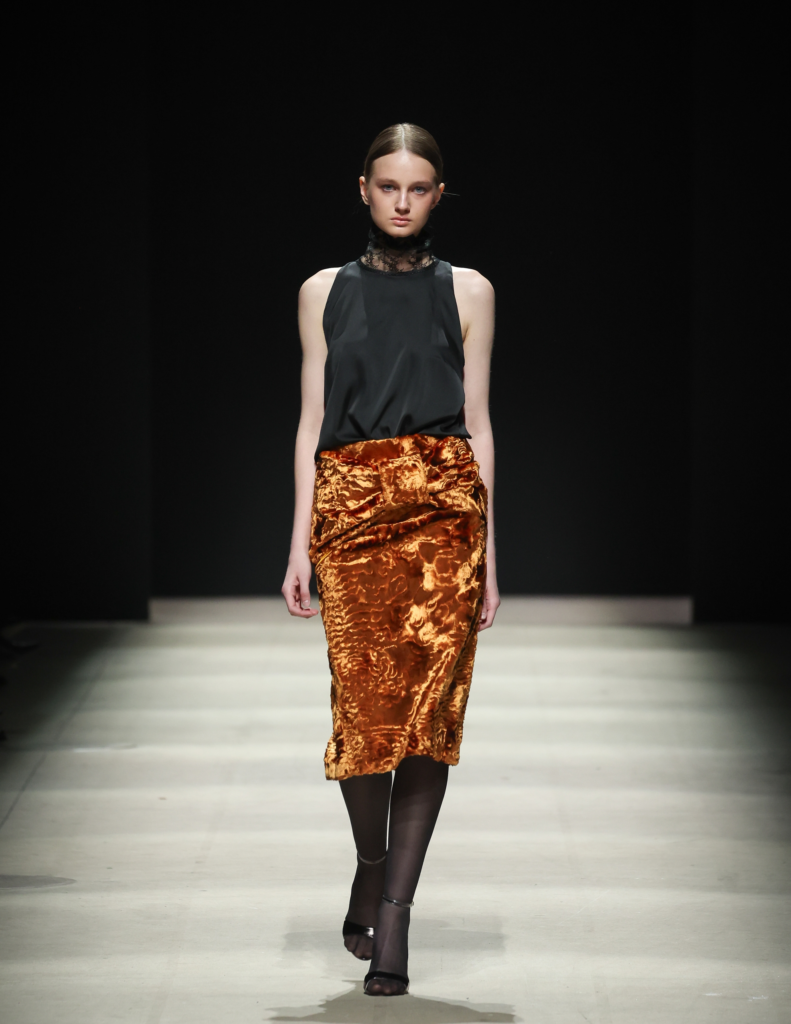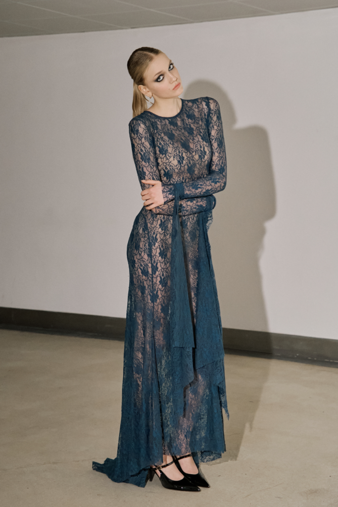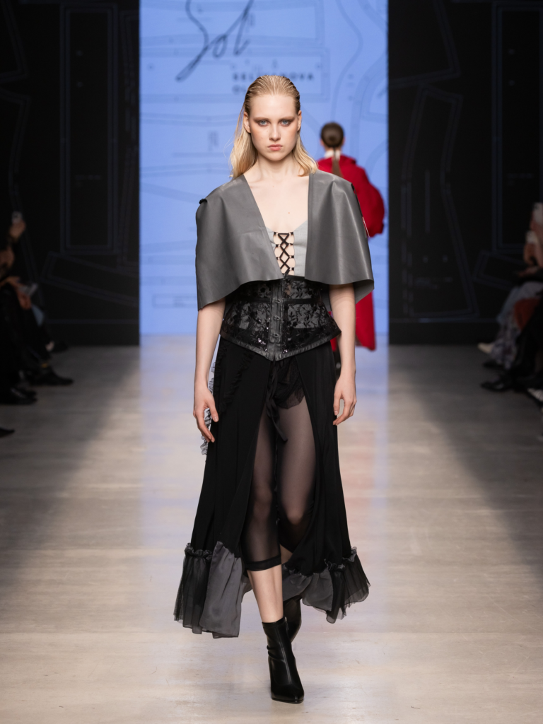 В центре коллекции столичного бренда SOL Selivanova Olga под названием Inside Out — наружные швы и кружево: оно струится в юбках, облегает фигуру в корсетах и играет роль аксессуаров.