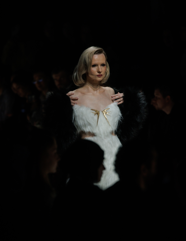 Новая коллекция под названием «Контрасты» состояла из кружевных вставок, которые сочетались с плотными материалами, а также летящих перьев, которые соседствовали с пайетками.