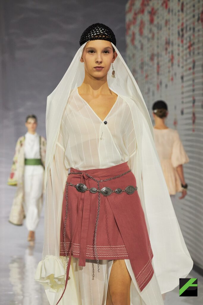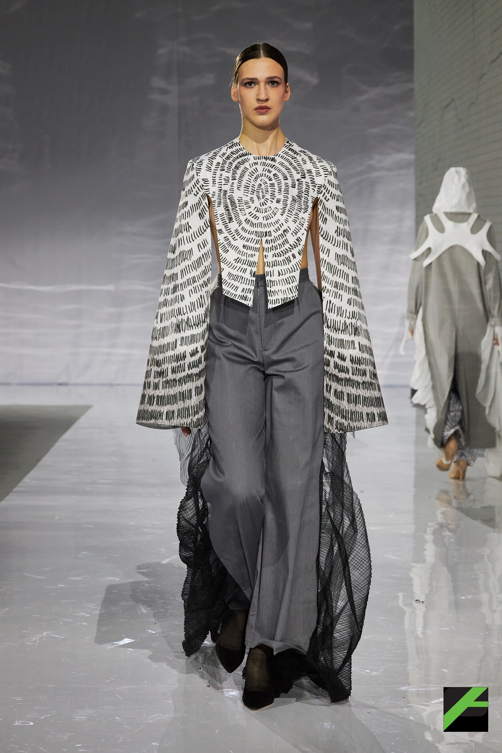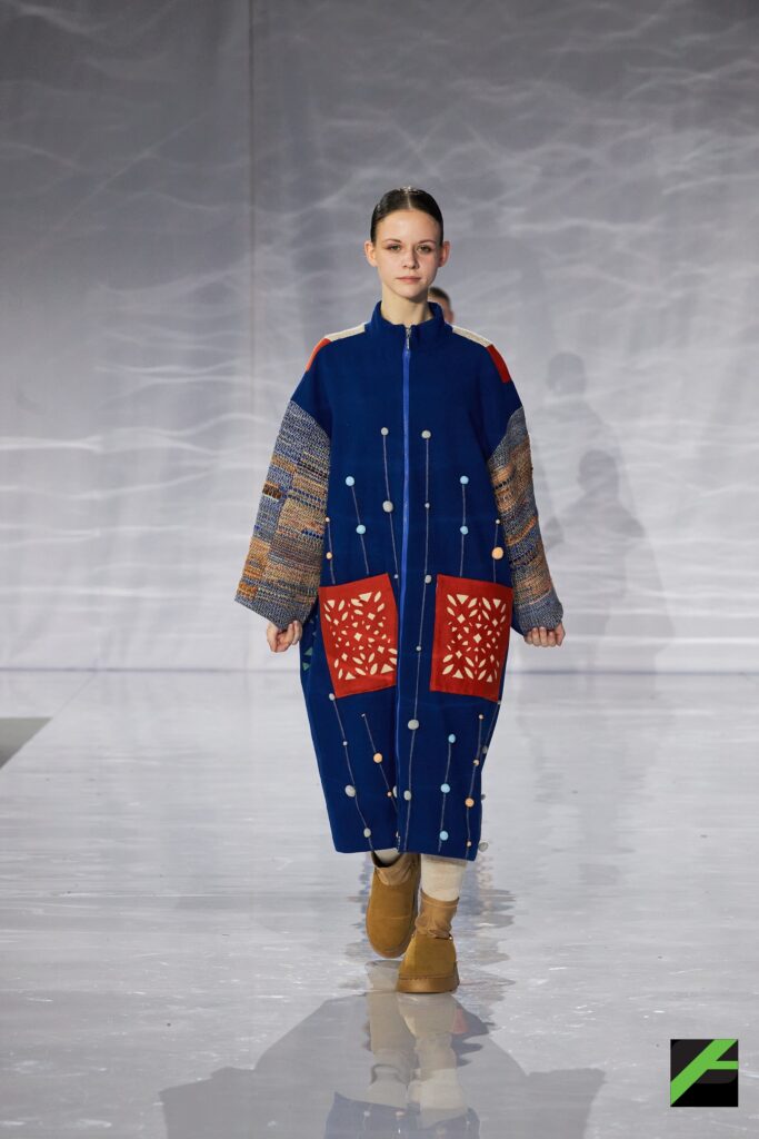 Яркое впечатление произвела коллекция «Моя земля» Анны Сергуновой-Козыревой — рукотворный манифест, сотканный из нитей памяти, артизанальная одежда, в которой дыхание традиций встречается с ритмом современности.