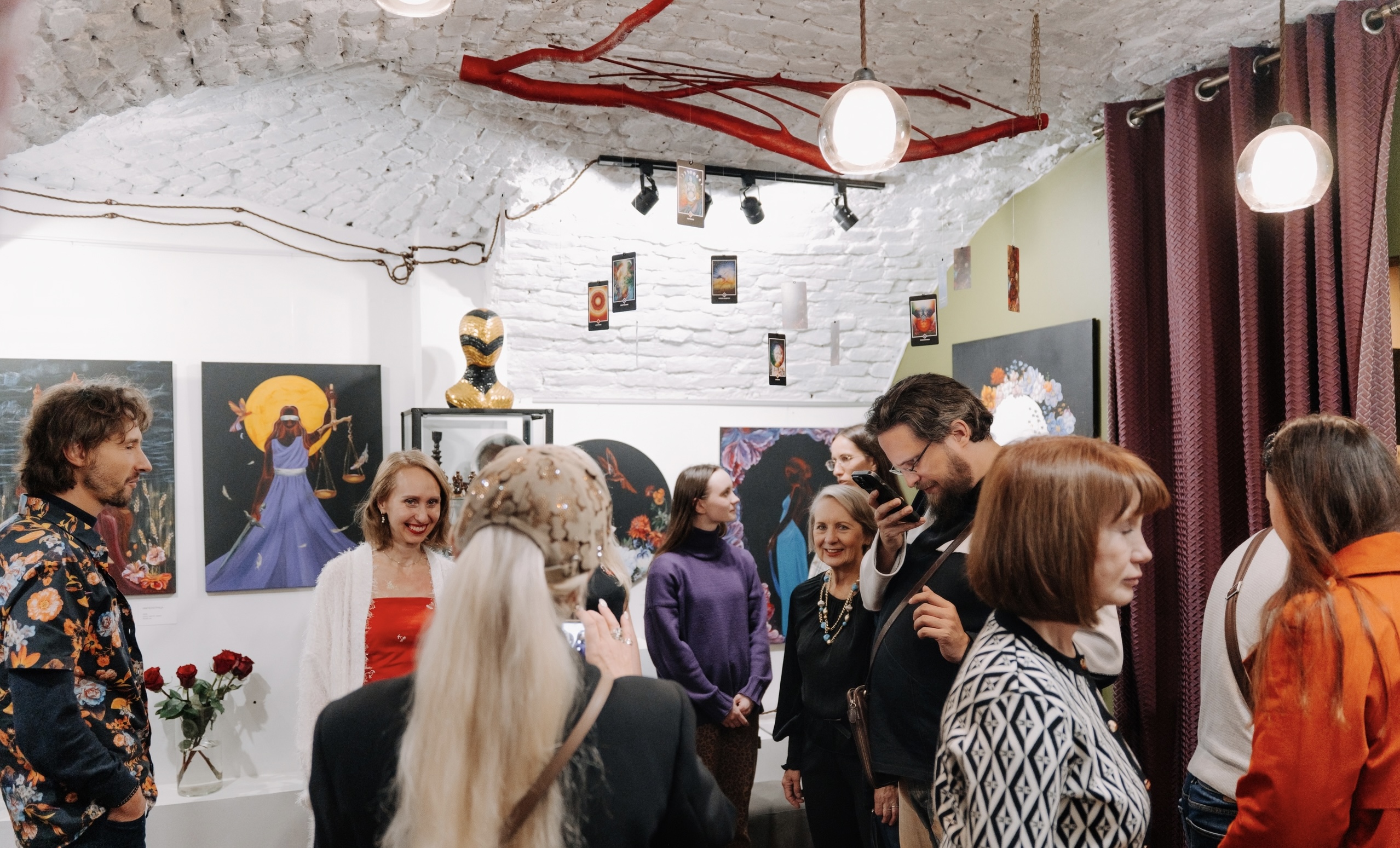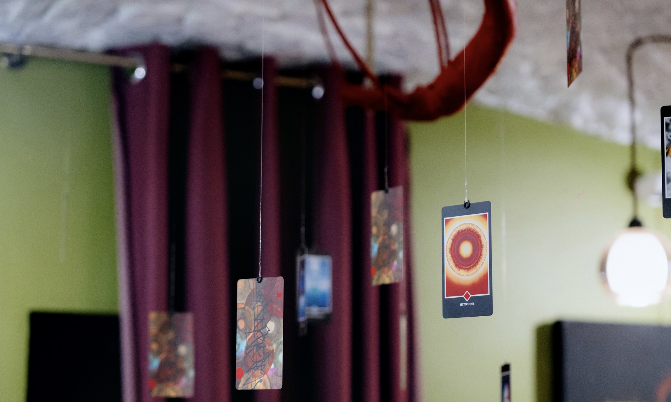 Пространство выставки передаем волшебную атмосферу. Рядом с картинами расположены настоящие карты Таро, магический шар и подсказки Ангелов, что даёт возможность каждому задать свой вопрос и получить ответ.