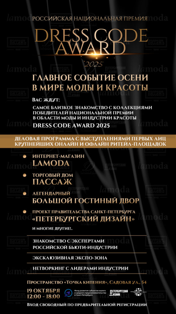 Российская национальная премия в области моды и индустрии красоты DRESS CODE AWARD — одно из значимых событий в сфере моды и красоты, объединяющее ведущих экспертов и лидеров рынка. Уже более десяти лет премия служит символом признания талантов и инноваций, а её лауреаты — ведущие российские компании и легендарные мировые бренды. Получить награду DRESS CODE AWARD — значит закрепить свой статус на федеральном уровне и стать частью формирования трендов в индустрии.